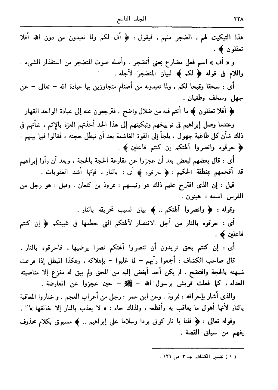 هذا التبكيت لهم، الضجر منهم، فيقول: أُفٍّ لَكُمْ وَلِما تَعْبُدُونَ مِنْ دُونِ اللَّهِ أَفَلا تَعْقِلُونَ.