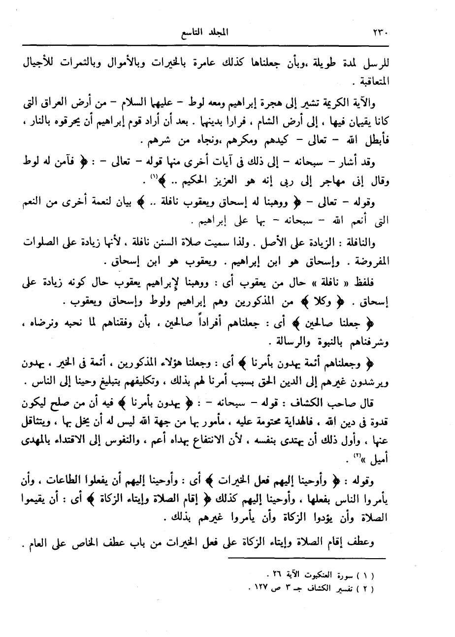 وقوله: وَأَوْحَيْنا إِلَيْهِمْ فِعْلَ الْخَيْراتِ أى: وأوحينا إليهم أن يفعلوا الطاعات، وأن يأمروا الناس بفعلها، وأوحينا إليهم كذلك إِقامَ الصَّلاةِ وَإِيتاءَ الزَّكاةِ أى: أن يقيموا الصلاة وأن يؤدوا الزكاة وأن يأمروا غيرهم بذلك.
