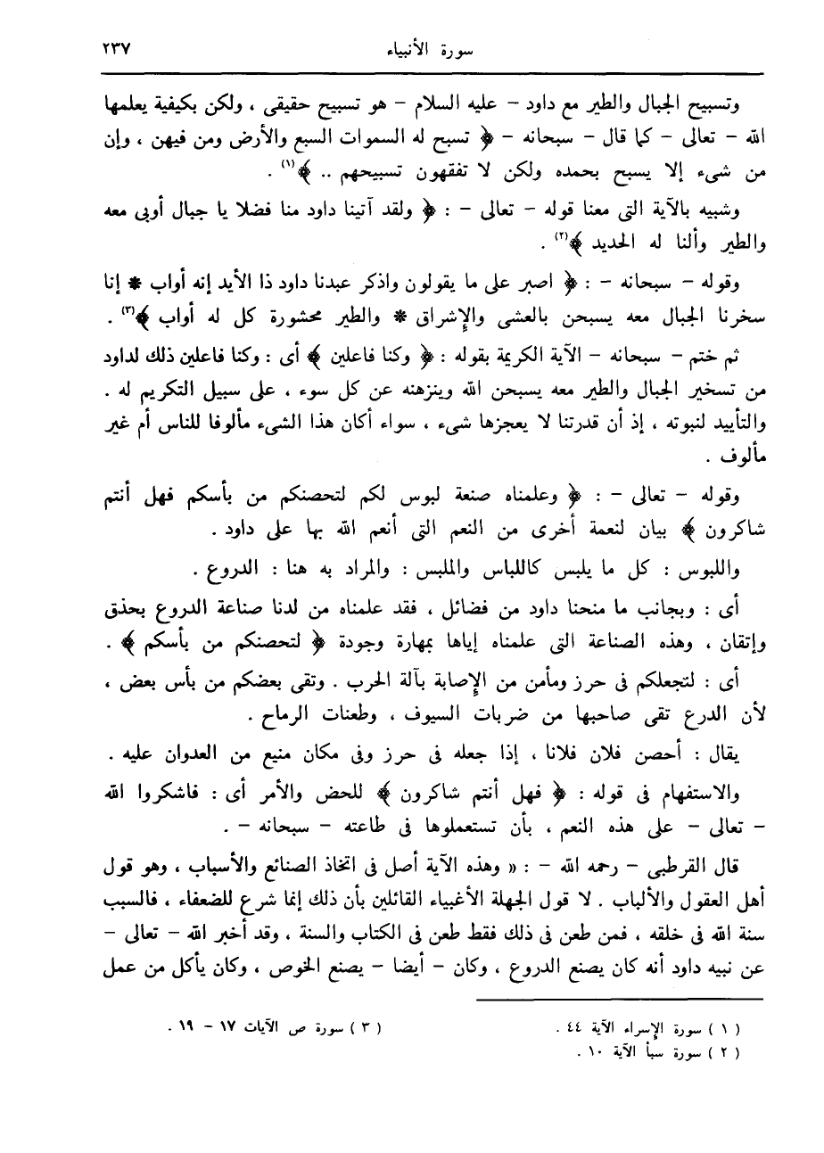 وتسبيح الجبال والطير مع داود- عليه السلام- هو تسبيح حقيقى، ولكن بكيفية يعلمها الله- تعالى- كما قال- سبحانه- تُسَبِّحُ لَهُ السَّماواتُ السَّبْعُ وَالْأَرْضُ وَمَنْ فِيهِنَّ، وَإِنْ مِنْ شَيْءٍ إِلَّا يُسَبِّحُ بِحَمْدِهِ وَلكِنْ لا تَفْقَهُونَ تَسْبِيحَهُمْ.. «1» .