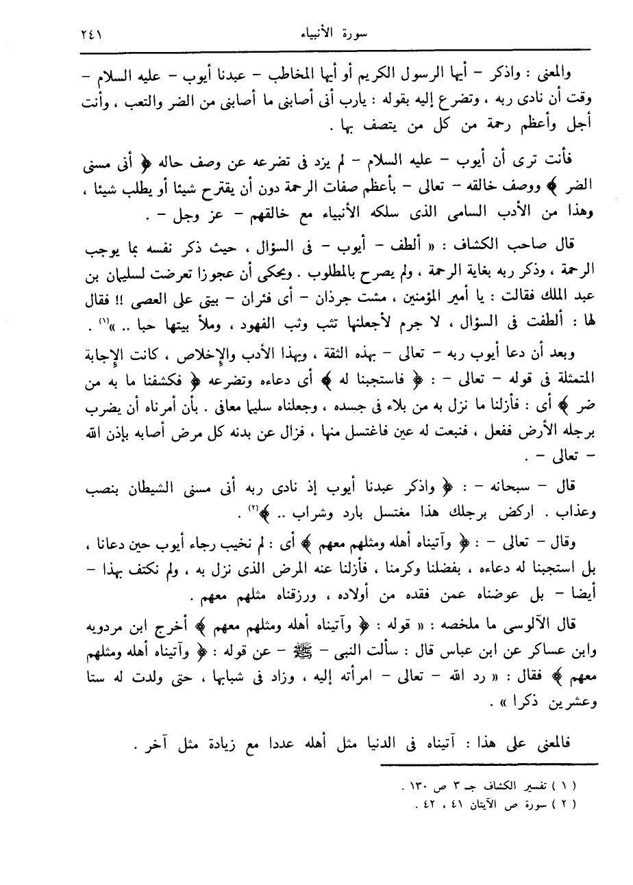 وقال- تعالى-: وَآتَيْناهُ أَهْلَهُ وَمِثْلَهُمْ مَعَهُمْ أى: لم نخيب رجاء أيوب حين دعانا، بل استجبنا له دعاءه، بفضلنا وكرمنا، فأزلنا عنه المرض الذي نزل به، ولم نكتف بهذا- أيضا- بل عوضناه عمن فقده من أولاده، ورزقناه مثلهم معهم.