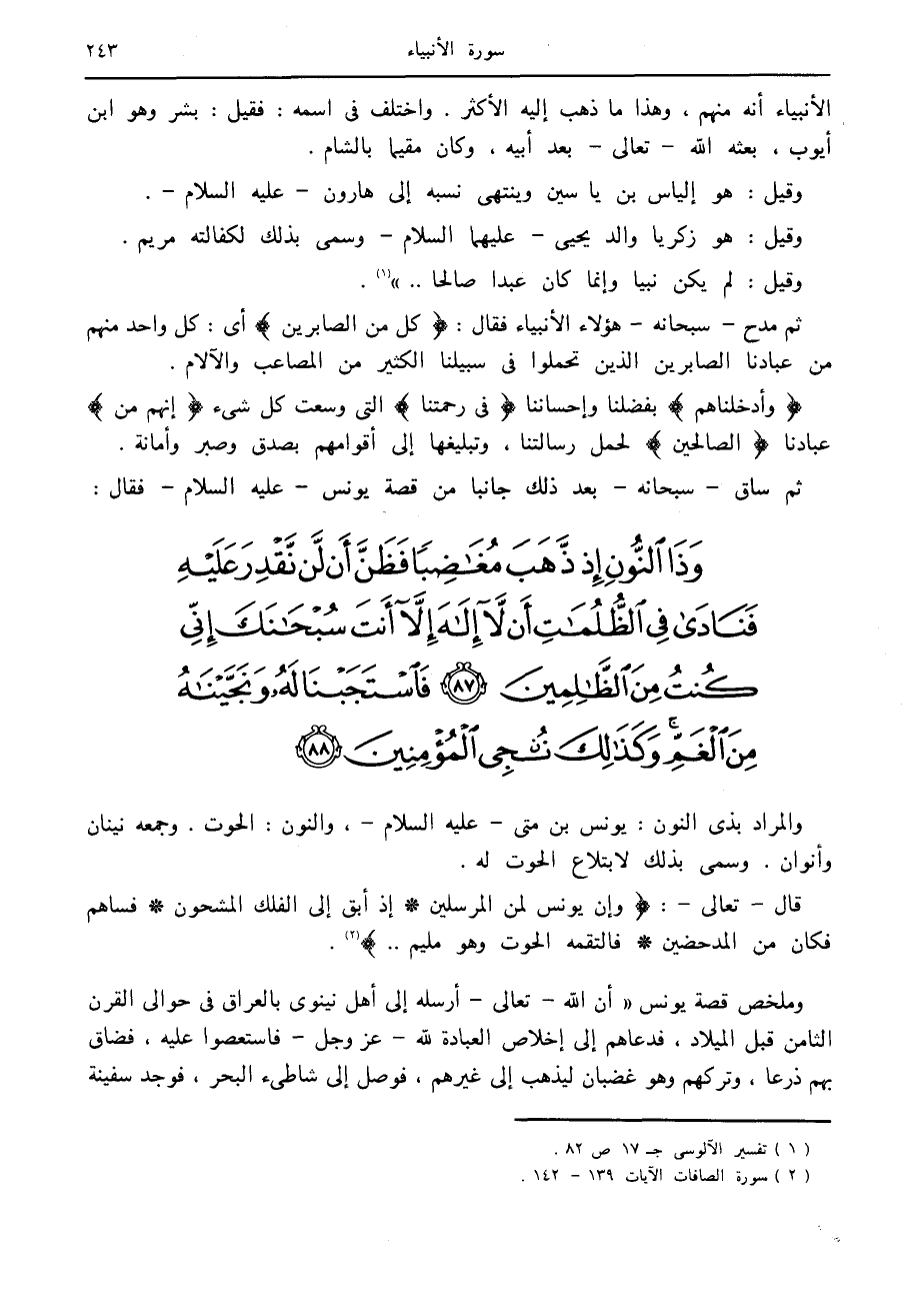 وَذَا النُّونِ إِذْ ذَهَبَ مُغاضِباً فَظَنَّ أَنْ لَنْ نَقْدِرَ عَلَيْهِ فَنادى فِي الظُّلُماتِ أَنْ لا إِلهَ إِلاَّ أَنْتَ سُبْحانَكَ إِنِّي كُنْتُ مِنَ الظَّالِمِينَ (87) فَاسْتَجَبْنا لَهُ وَنَجَّيْناهُ مِنَ الْغَمِّ وَكَذلِكَ نُنْجِي الْمُؤْمِنِينَ (88)