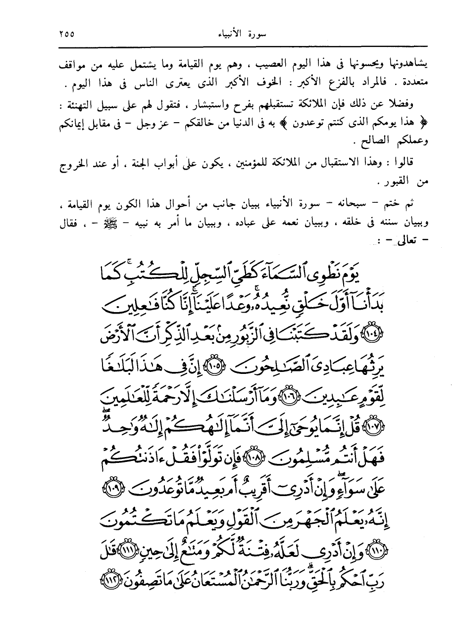 ثم ختم- سبحانه- سورة الأنبياء ببيان جانب من أحوال هذا الكون يوم القيامة، وببيان سننه في خلقه، وببيان نعمه على عباده، وببيان ما أمر به نبيه صلّى الله عليه وسلّم، فقال- تعالى-: