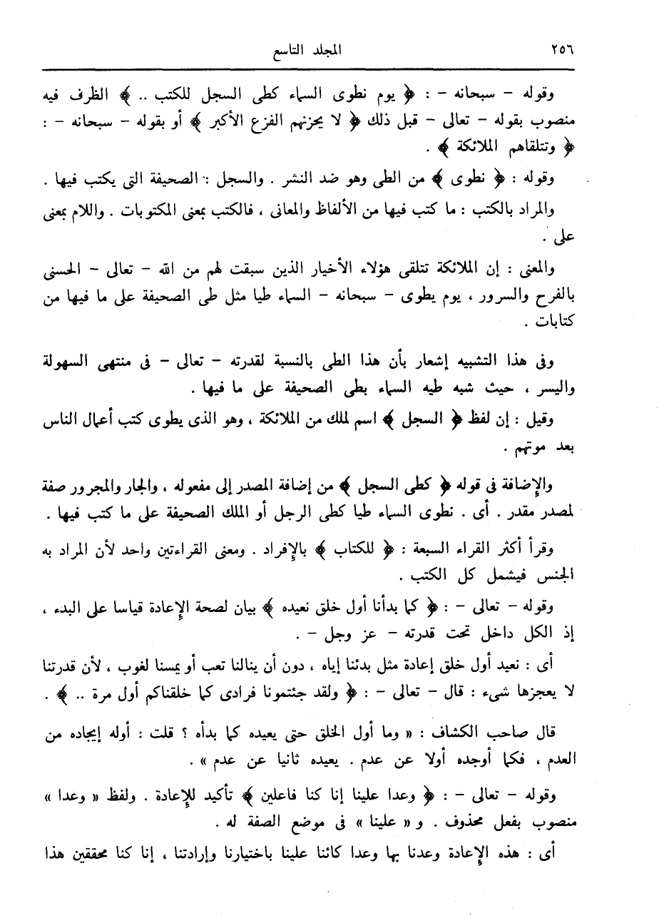 وقوله: نَطْوِي من الطى وهو ضد النشر. والسجل: الصحيفة التي يكتب فيها.