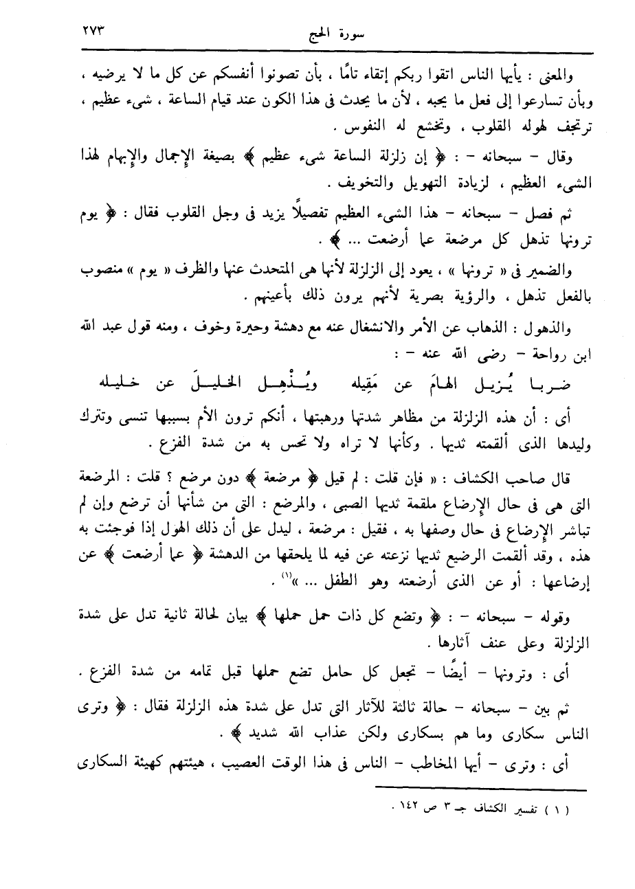 دون مرضع؟ قلت: المرضعة التي هي في حال الإرضاع ملقمة ثديها الصبى، والمرضع: التي من شأنها أن ترضع وإن لم تباشر الإرضاع في حال وصفها به، فقيل: مرضعة، ليدل على أن ذلك الهول إذا فوجئت به هذه، وقد ألقمت الرضيع ثديها نزعته عن فيه لما يلحقها من الدهشة عَمَّا أَرْضَعَتْ