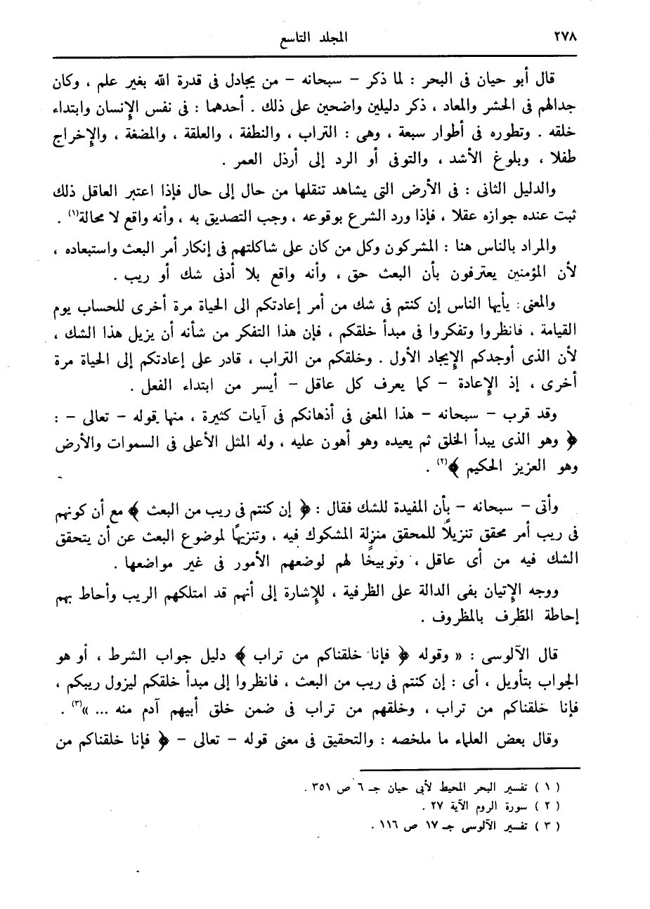 وأتى- سبحانه- بأن المفيدة للشك فقال: إِنْ كُنْتُمْ فِي رَيْبٍ مِنَ الْبَعْثِ مع أن كونهم في ريب أمر محقق تنزيلا للمحقق منزلة المشكوك فيه، وتنزيها لموضوع البعث عن أن يتحقق الشك فيه من أى عاقل، وتوبيخا لهم لوضعهم الأمور في غير مواضعها.