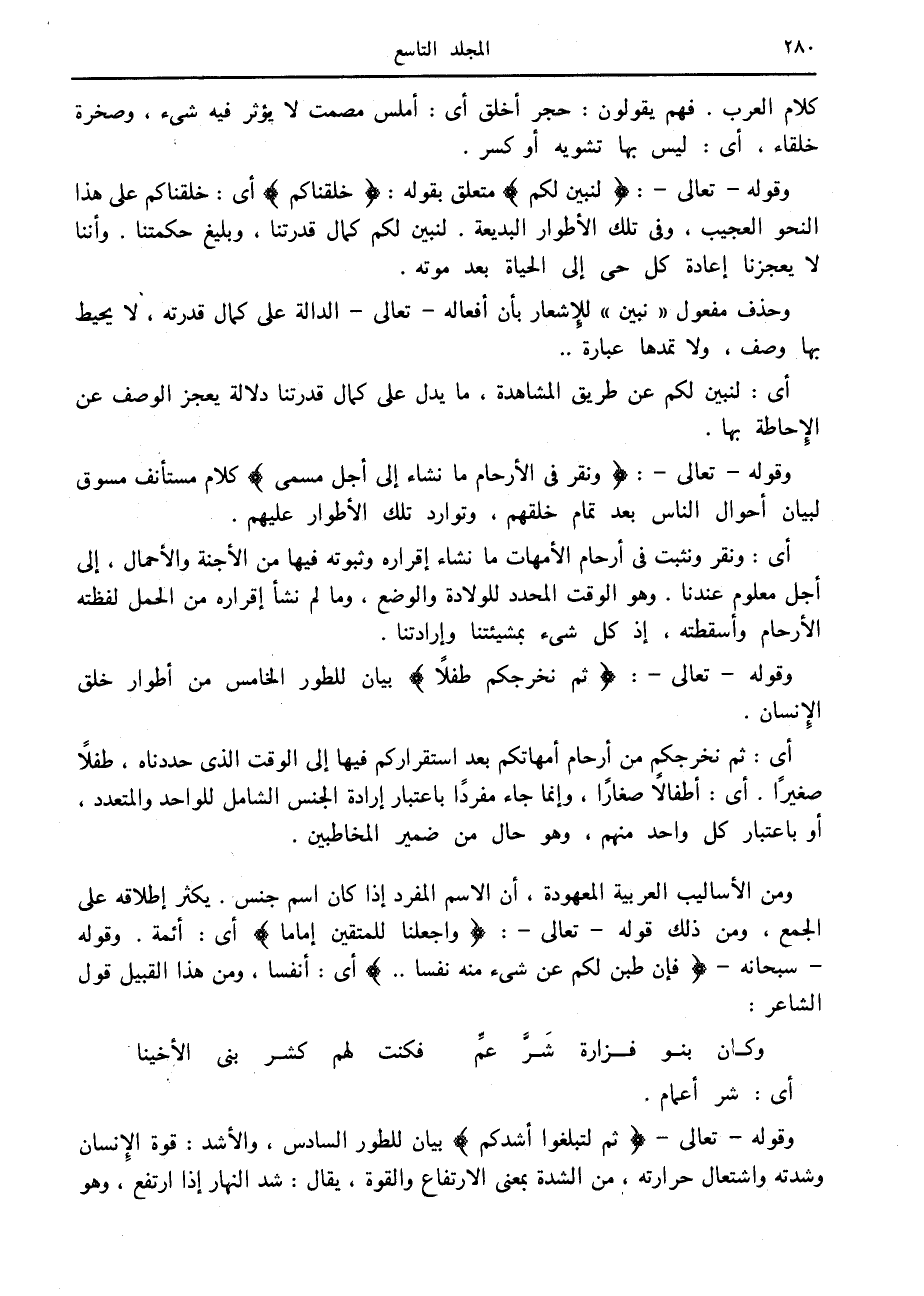 وقوله- تعالى-: لِنُبَيِّنَ لَكُمْ متعلق بقوله: خَلَقْناكُمْ أى: خلقناكم على هذا النحو العجيب، وفي تلك الأطوار البديعة. لنبين لكم كمال قدرتنا، وبليغ حكمتنا. وأننا لا يعجزنا إعادة كل حي إلى الحياة بعد موته.