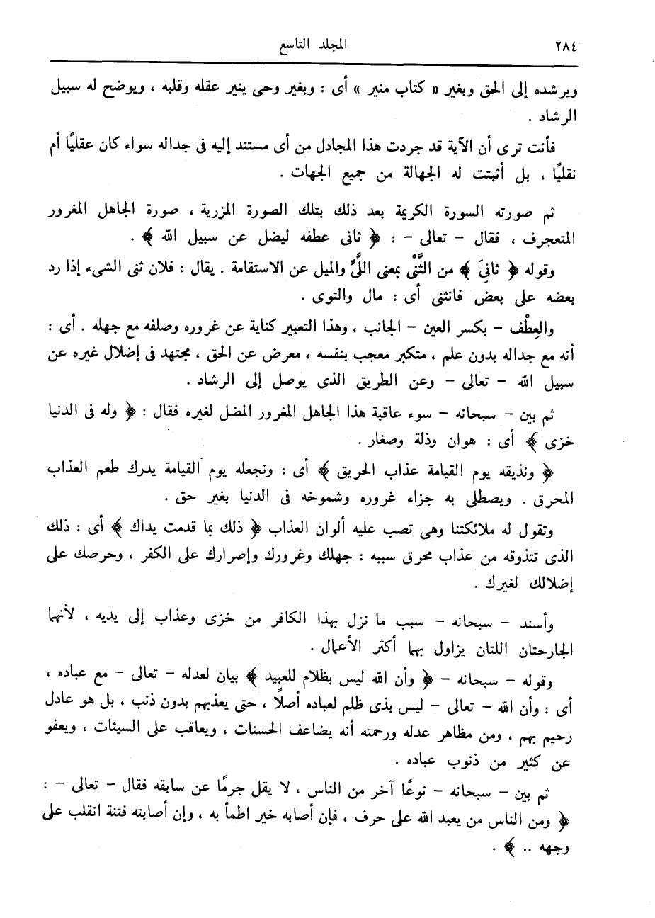 ثم صورته السورة الكريمة بعد ذلك بتلك الصورة المزرية، صورة الجاهل المغرور المتعجرف، فقال- تعالى-: ثانِيَ عِطْفِهِ لِيُضِلَّ عَنْ سَبِيلِ اللَّهِ.