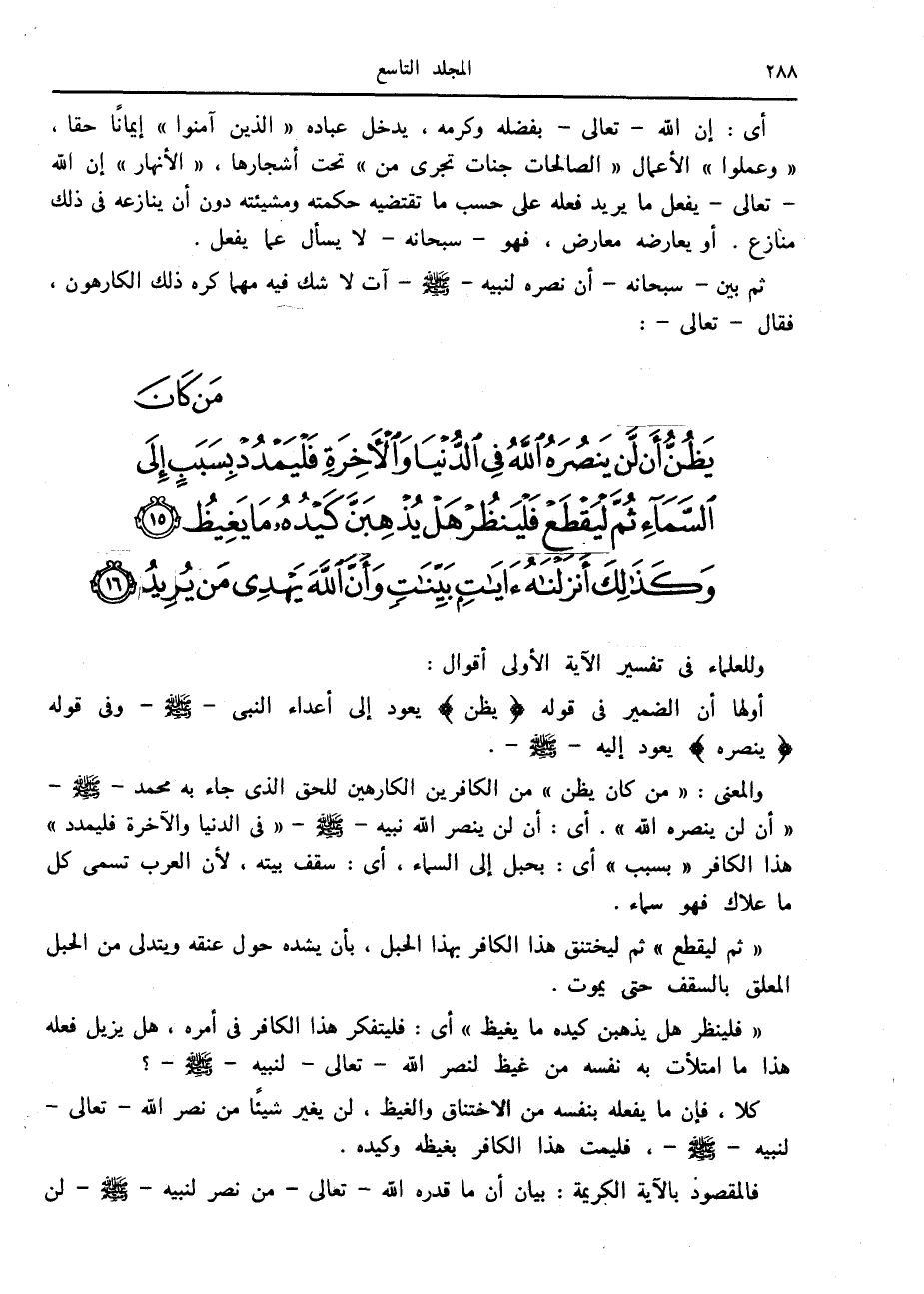 أولها أن الضمير في قوله يَظُنُّ يعود إلى أعداء النبي صلّى الله عليه وسلّم وفي قوله يَنْصُرَهُ يعود إليه صلّى الله عليه وسلّم والمعنى: «من كان يظن» من الكافرين الكارهين للحق الذي جاء به محمد صلّى الله عليه وسلّم «أن لن ينصره الله» . أى: أن لن ينصر الله نبيه صلّى الله عليه وسلّم «في الدنيا والآخرة فليمدد» هذا الكافر «بسبب» أى: بحبل إلى السماء، أى: سقف بيته، لأن العرب تسمى كل ما علاك فهو سماء.