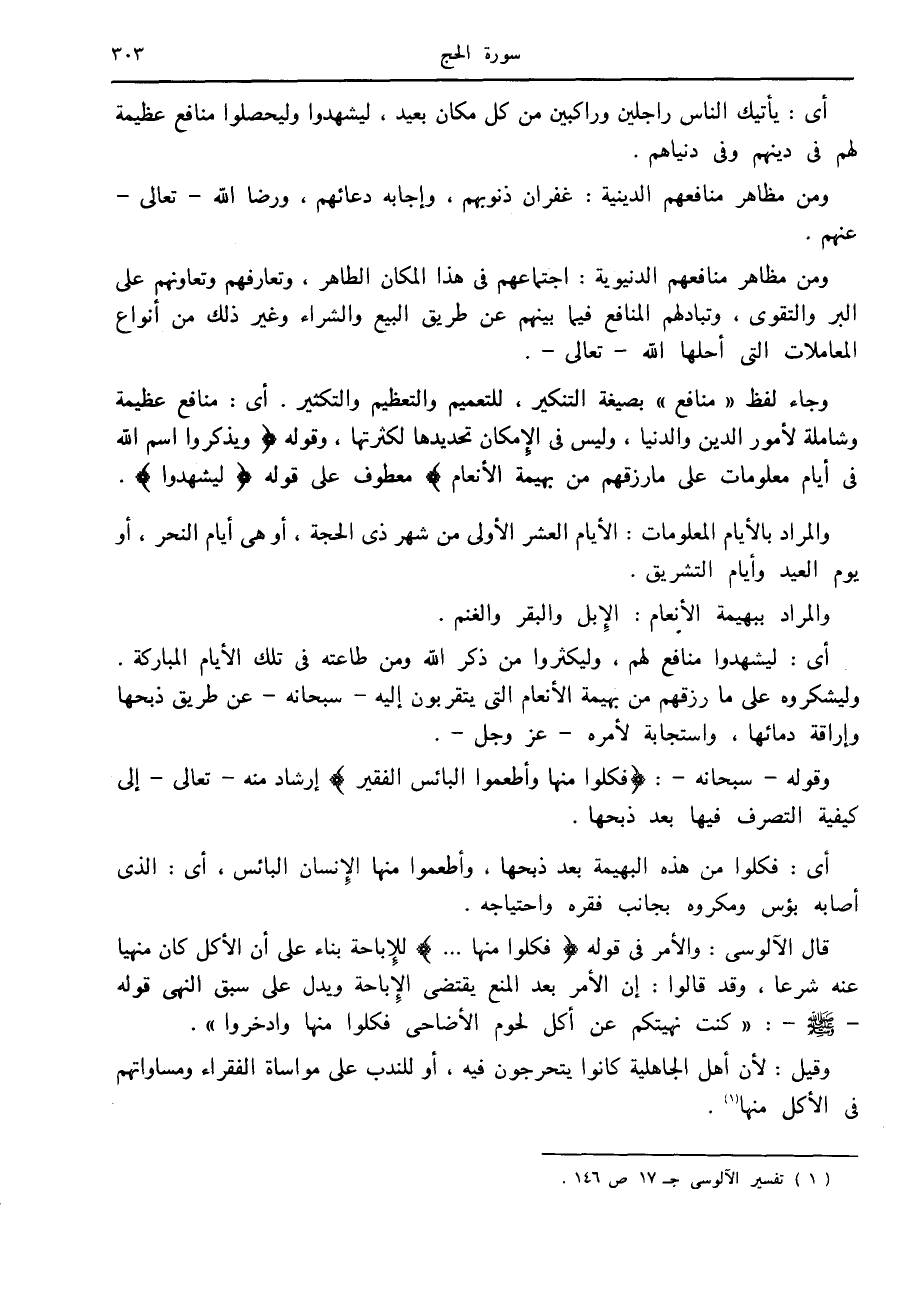 وجاء لفظ «منافع» بصيغة التنكير، للتعميم والتعظيم والتكثير. أى: منافع عظيمة وشاملة لأمور الدين والدنيا، وليس في الإمكان تحديدها لكثرتها، وقوله وَيَذْكُرُوا اسْمَ اللَّهِ فِي أَيَّامٍ مَعْلُوماتٍ عَلى ما رَزَقَهُمْ مِنْ بَهِيمَةِ الْأَنْعامِ معطوف على قوله لِيَشْهَدُوا.
