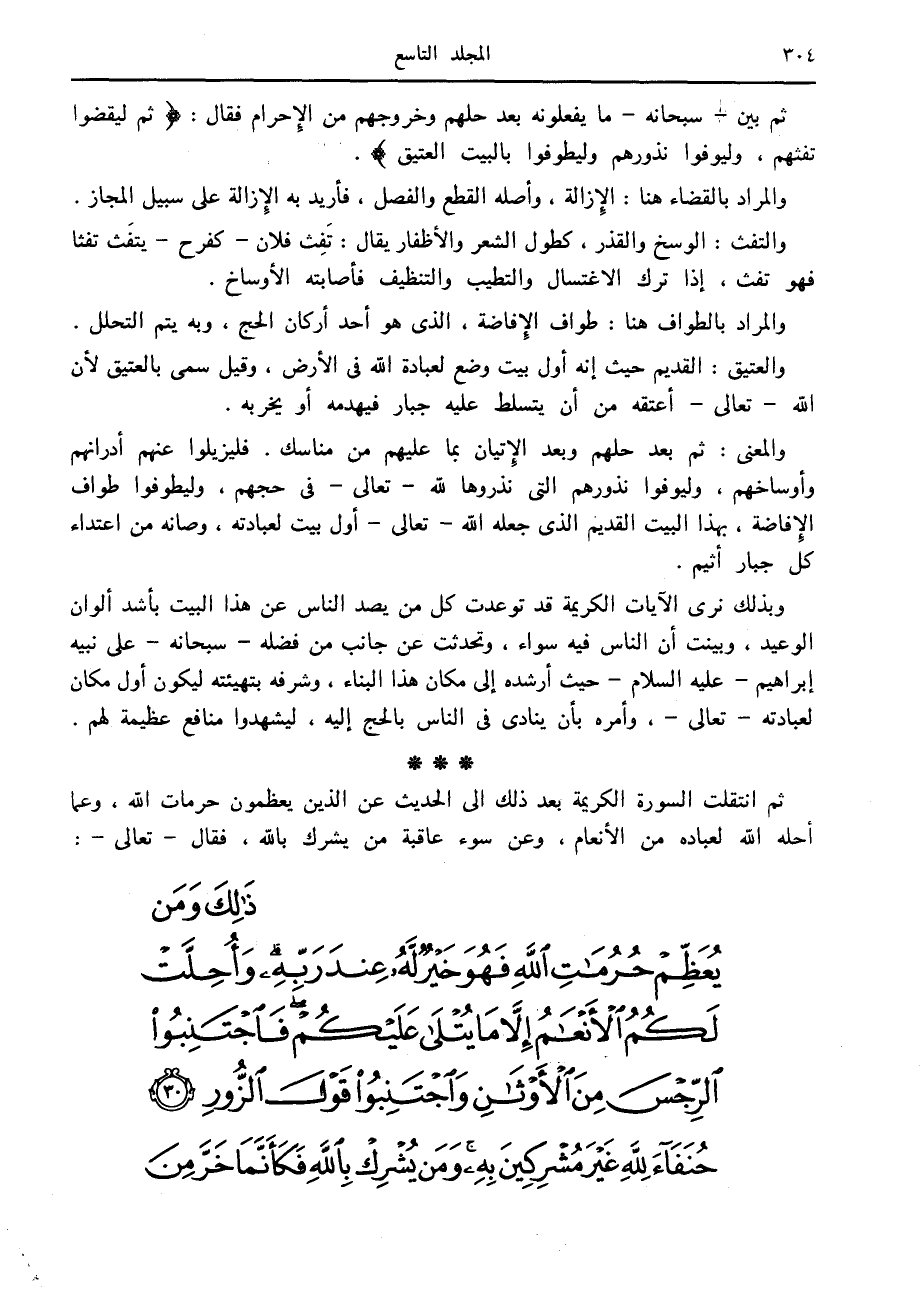ثم انتقلت السورة الكريمة بعد ذلك الى الحديث عن الذين يعظمون حرمات الله، وعما أحله الله لعباده من الأنعام، وعن سوء عاقبة من يشرك بالله، فقال- تعالى-:
