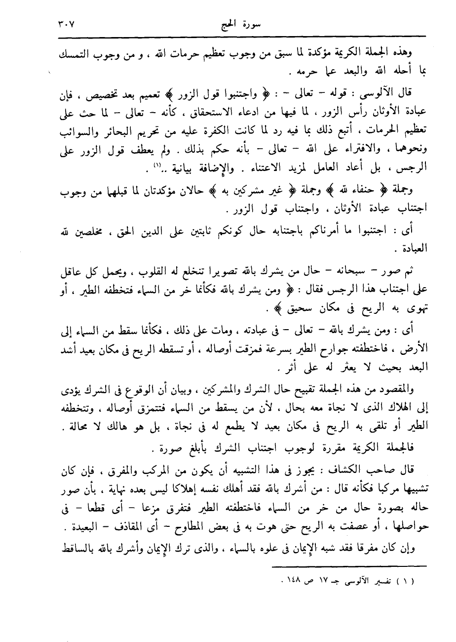 قال الآلوسى: قوله- تعالى-: وَاجْتَنِبُوا قَوْلَ الزُّورِ تعميم بعد تخصيص، فإن عبادة الأوثان رأس الزور، لما فيها من ادعاء الاستحقاق، كأنه- تعالى- لما حث على تعظيم الحرمات، أتبع ذلك بما فيه رد لما كانت الكفرة عليه من تحريم البحائر والسوائب ونحوهما، والافتراء على الله- تعالى- بأنه حكم بذلك. ولم يعطف قول الزور على الرجس، بل أعاد العامل لمزيد الاعتناء. والإضافة بيانية.. «1» .