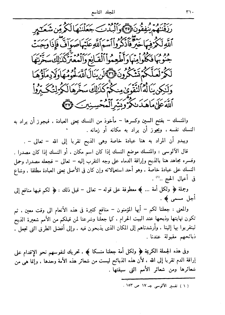 وفي هذه الجملة الكريمة وَلِكُلِّ أُمَّةٍ جَعَلْنا مَنْسَكاً، تحريك لنفوسهم نحو الإقدام على إراقة الدم تقربا إلى الله، لأن هذه الذبائح ليست من شعائر هذه الأمة وحدها، وإنما هي من شعائرها ومن شعائر الأمم التي سبقتها.