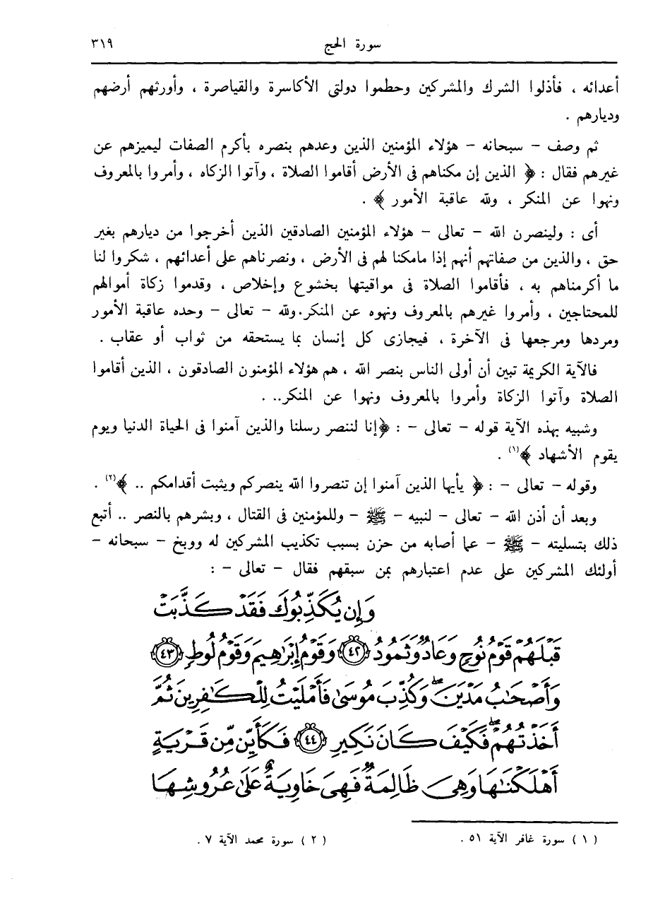 وشبيه بهذه الآية قوله- تعالى-: إِنَّا لَنَنْصُرُ رُسُلَنا وَالَّذِينَ آمَنُوا فِي الْحَياةِ الدُّنْيا وَيَوْمَ يَقُومُ الْأَشْهادُ «1» .