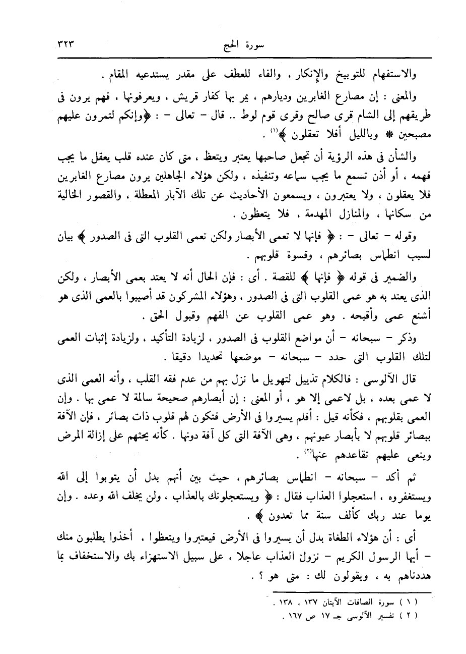 قال الآلوسى: فالكلام تذييل لتهويل ما نزل بهم من عدم فقه القلب، وأنه العمى الذي لا عمى بعده، بل لا عمى إلا هو، أو المعنى: إن أبصارهم صحيحة سالمة لا عمى بها. وإن العمى بقلوبهم، فكأنه قيل: أفلم يسيروا في الأرض فتكون لهم قلوب ذات بصائر، فإن الآفة ببصائر قلوبهم لا بأبصار عيونهم، وهي الآفة التي كل آفة دونها. كأنه يحثهم على إزالة المرض وينعى عليهم تقاعدهم عنها «2» .