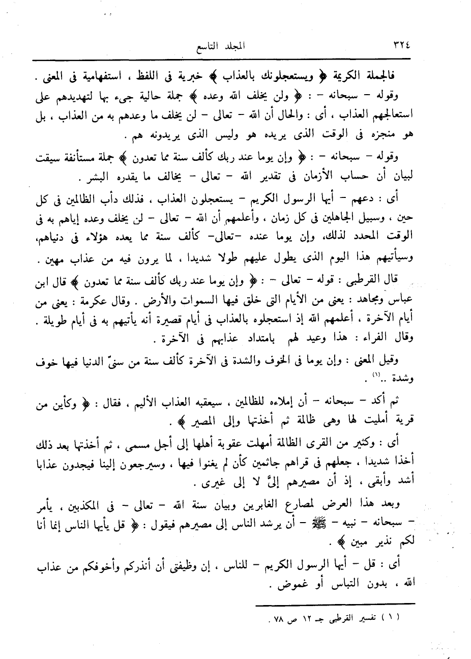 قال القرطبي: قوله- تعالى-: وَإِنَّ يَوْماً عِنْدَ رَبِّكَ كَأَلْفِ سَنَةٍ مِمَّا تَعُدُّونَ قال ابن عباس ومجاهد: يعنى من الأيام التي خلق فيها السموات والأرض. وقال عكرمة: يعنى من أيام الآخرة، أعلمهم الله إذ استعجلوه بالعذاب في أيام قصيرة أنه يأتيهم به في أيام طويلة.