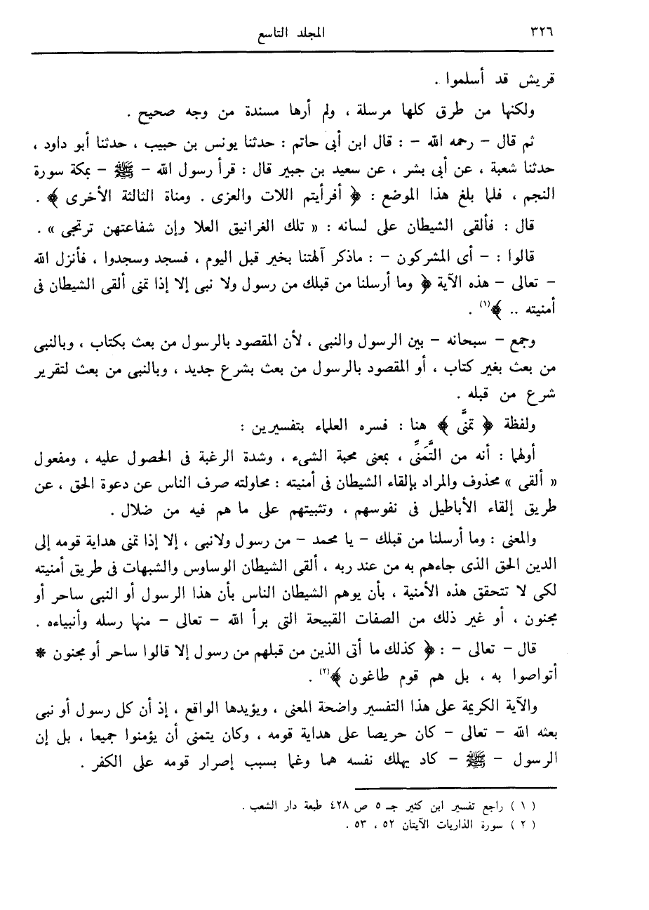 قالوا: - أى المشركون-: ما ذكر آلهتنا بخير قبل اليوم، فسجد وسجدوا، فأنزل الله- تعالى- هذه الآية وَما أَرْسَلْنا مِنْ قَبْلِكَ مِنْ رَسُولٍ وَلا نَبِيٍّ إِلَّا إِذا تَمَنَّى أَلْقَى الشَّيْطانُ فِي أُمْنِيَّتِهِ.. «1» .