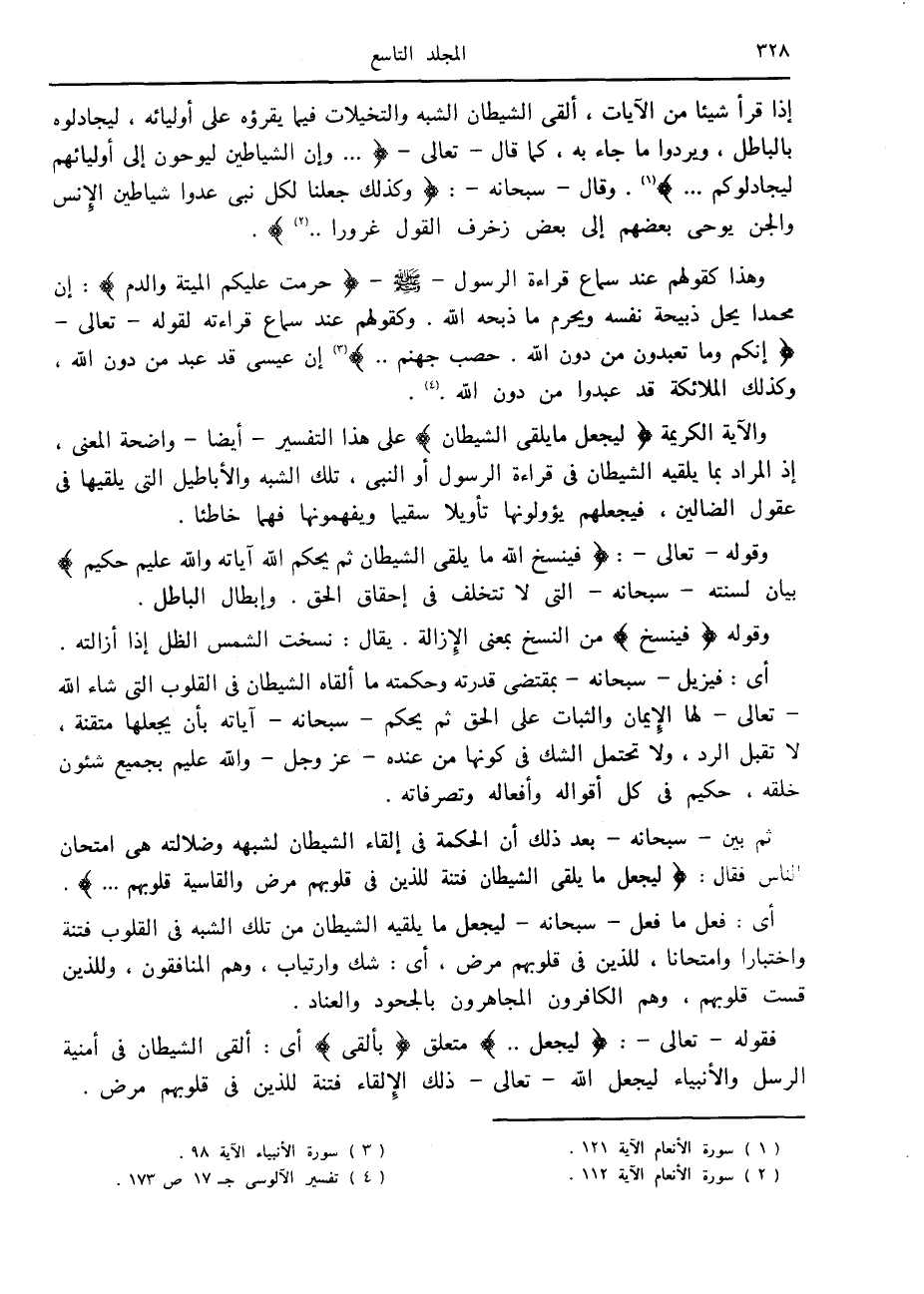 والآية الكريمة لِيَجْعَلَ ما يُلْقِي الشَّيْطانُ على هذا التفسير- أيضا- واضحة المعنى، إذ المراد بما يلقيه الشيطان في قراءة الرسول أو النبي، تلك الشبه والأباطيل التي يلقيها في عقول الضالين، فيجعلهم يؤولونها تأويلا سقيما ويفهمونها فهما خاطئا.
