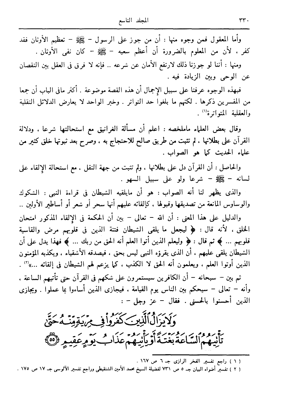 وقال بعض العلماء ما ملخصه: اعلم أن مسألة الغرانيق مع استحالتها شرعا، ودلالة القرآن على بطلانها، لم تثبت من طريق صالح للاحتجاج به، وصرح بعد ثبوتها خلق كثير من علماء الحديث كما هو الصواب.