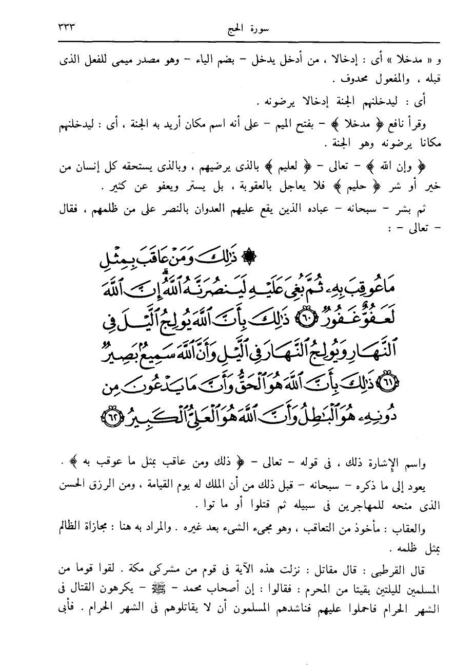 ذلِكَ وَمَنْ عاقَبَ بِمِثْلِ ما عُوقِبَ بِهِ ثُمَّ بُغِيَ عَلَيْهِ لَيَنْصُرَنَّهُ اللَّهُ إِنَّ اللَّهَ لَعَفُوٌّ غَفُورٌ (60) ذلِكَ بِأَنَّ اللَّهَ يُولِجُ اللَّيْلَ فِي النَّهارِ وَيُولِجُ النَّهارَ فِي اللَّيْلِ وَأَنَّ اللَّهَ سَمِيعٌ بَصِيرٌ (61) ذلِكَ بِأَنَّ اللَّهَ هُوَ الْحَقُّ وَأَنَّ ما يَدْعُونَ مِنْ دُونِهِ هُوَ الْباطِلُ وَأَنَّ اللَّهَ هُوَ الْعَلِيُّ الْكَبِيرُ (62)