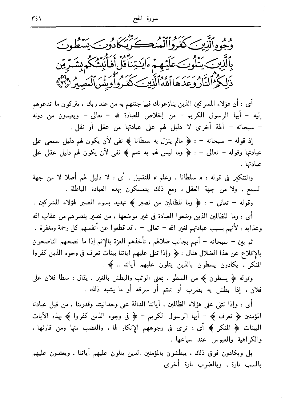 ثم بين- سبحانه- أنهم بجانب ضلالهم، تأخذهم العزة بالإثم إذا ما نصحهم الناصحون بالإقلاع عن هذا الضلال فقال: وَإِذا تُتْلى عَلَيْهِمْ آياتُنا بَيِّناتٍ تَعْرِفُ فِي وُجُوهِ الَّذِينَ كَفَرُوا الْمُنْكَرَ، يَكادُونَ يَسْطُونَ بِالَّذِينَ يَتْلُونَ عَلَيْهِمْ آياتِنا ...