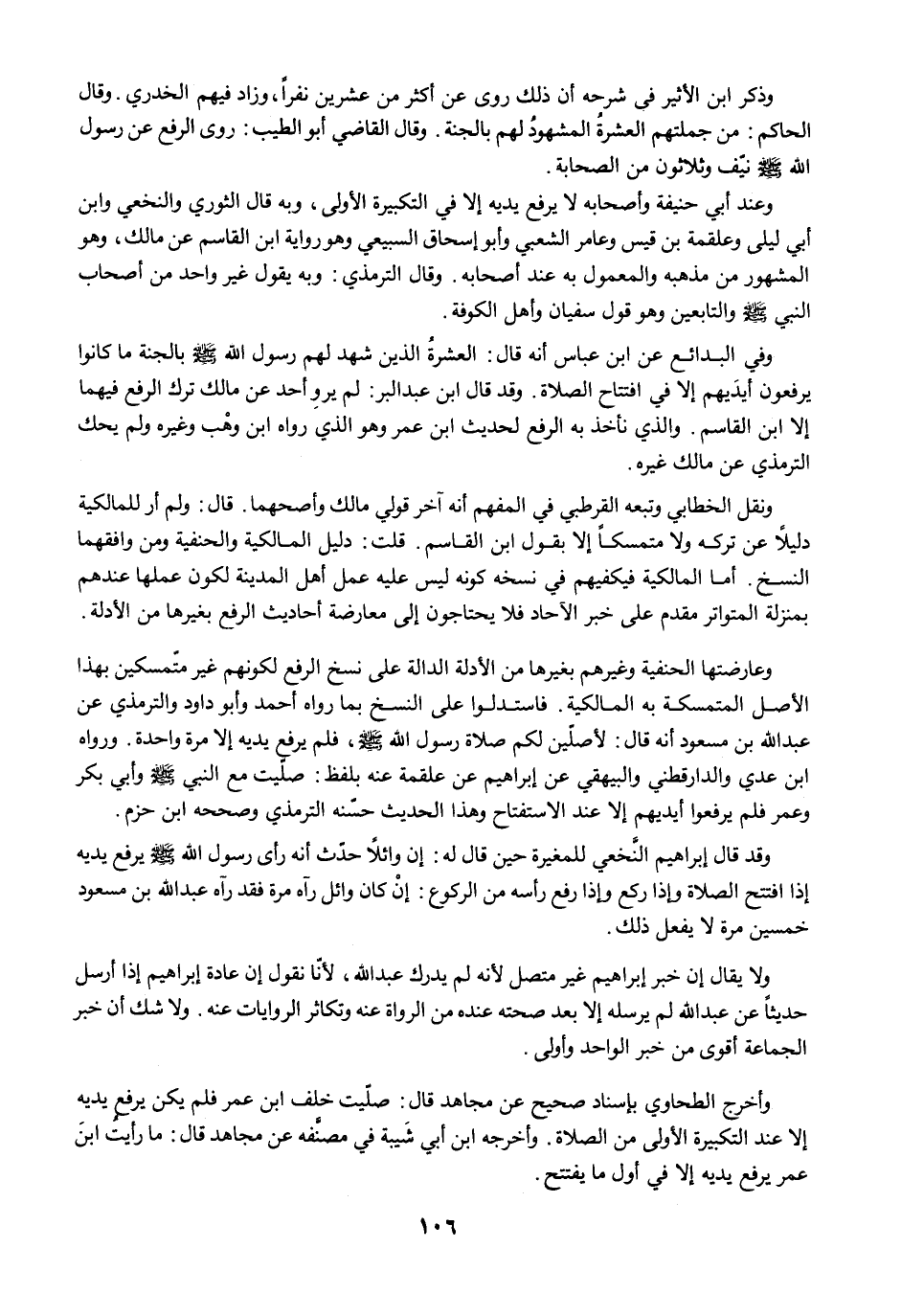 وفي البدائع عن ابن عباس أنه قال: العشرةُ الذين شهد لهم رسول الله -صلى الله عليه وسلم- بالجنة ما كانوا يرفعون أيدَيهم إلا في افتتاح الصلاة. وقد قال ابن عبد البر: لم يروِ أحد عن مالك ترك الرفع فيهما إلا ابن القاسم. والذي نأخذ به الرفع لحديث ابن عمر وهو الذي رواه ابن وهْب وغيره ولم يحك الترمذي عن مالك غيره.