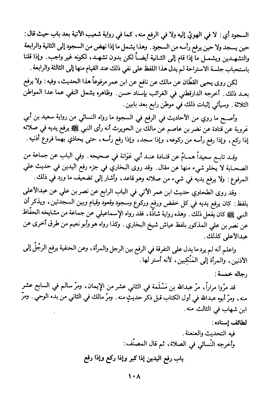 وقد روى الطحاوي حديث ابن عمر الآتي في الباب الرابع عن نصر بن علي عن عبد الأعلى بلفظ: كان يرفع يديه في كل خفض ورفع وركوع وسجود وقعود وقيام وبين السجدتين، ويذكر أن النبي -صلى الله عليه وسلم- كان يفعل ذلك. وهذه رواية شاذة، فقد رواه الإسماعيلي عن جماعة من مشايخه الحفاظ عن نصر بن علي المذكور بلفظ عياش شيخ البخاري. وكذا رواه هو وأبو نعيم من طرق أخرى عن عبد الأعلى كذلك.