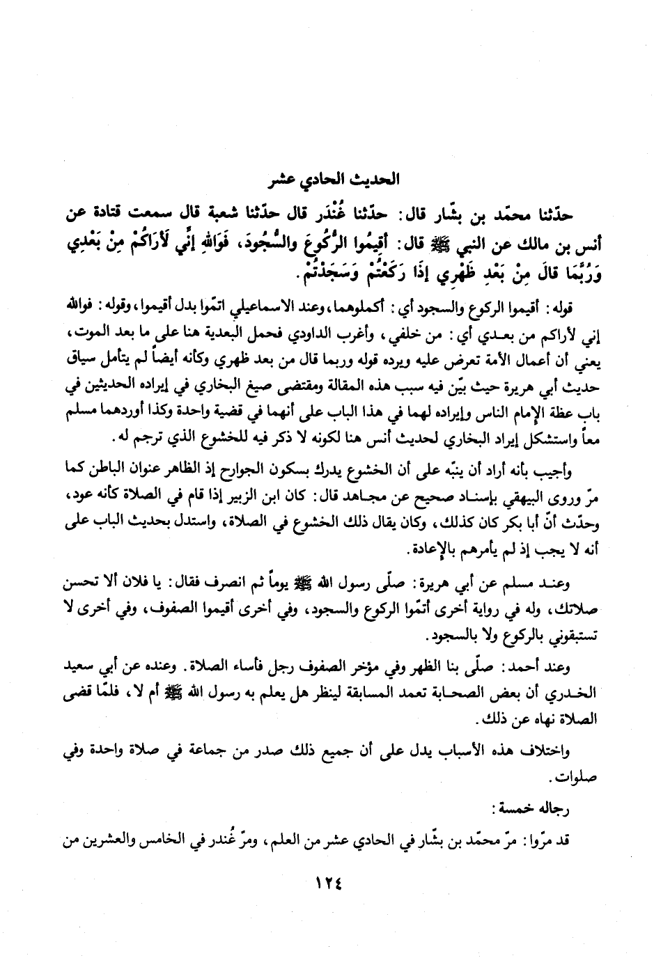 حَدَّثَنَا مُحَمَّدُ بْنُ بَشَّارٍ قَالَ: حَدَّثَنَا غُنْدَرٌ قَالَ حَدَّثَنَا شُعْبَةُ قَالَ سَمِعْتُ قَتَادَةَ عَنْ أَنَسِ بْنِ مَالِكٍ عَنِ النَّبِيِّ -صلى الله عليه وسلم- قَالَ: أَقِيمُوا الرُّكُوعَ وَالسُّجُودَ، فَوَاللَّهِ إِنِّي لأَرَاكُمْ مِنْ بَعْدِي وَرُبَّمَا قَالَ مِنْ بَعْدِ ظَهْرِي إِذَا رَكَعْتُمْ وَسَجَدْتُمْ.