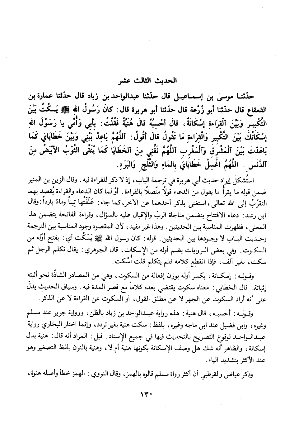 حَدَّثَنَا مُوسَى بْنُ إِسْمَاعِيلَ قَالَ حَدَّثَنَا عَبْدُ الْوَاحِدِ بْنُ زِيَادٍ قَالَ حَدَّثَنَا عُمَارَةُ بْنُ الْقَعْقَاعِ قَالَ حَدَّثَنَا أَبُو زُرْعَةَ قَالَ حَدَّثَنَا أَبُو هُرَيْرَةَ قَالَ: كَانَ رَسُولُ اللَّهِ -صلى الله عليه وسلم- يَسْكُتُ بَيْنَ التَّكْبِيرِ وَبَيْنَ الْقِرَاءَةِ إِسْكَاتَةً، قَالَ أَحْسِبُهُ قَالَ هُنَيَّةً فَقُلْتُ: بِأَبِي وَأُمِّي يَا رَسُولَ اللَّهِ، إِسْكَاتُكَ بَيْنَ التَّكْبِيرِ وَالْقِرَاءَةِ مَا تَقُولُ قَالَ أَقُولُ: اللَّهُمَّ بَاعِدْ بَيْنِي وَبَيْنَ خَطَايَايَ كَمَا بَاعَدْتَ بَيْنَ الْمَشْرِقِ وَالْمَغْرِبِ، اللَّهُمَّ نَقِّنِي مِنَ الْخَطَايَا كَمَا يُنَقَّى الثَّوْبُ الأَبْيَضُ مِنَ الدَّنَسِ، اللَّهُمَّ اغْسِلْ خَطَايَايَ بِالْمَاءِ وَالثَّلْجِ وَالْبَرَدِ.