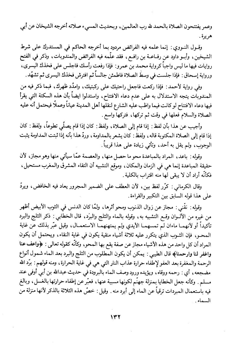 وقال الكرماني: كرّر لفظ بين؛ لأن العطف على الضمير المجرور يعاد فيه الخافض، ويردّ على هذا قوله السابق بين التكبير والقراءة. وقوله: نقّني: مجاز عن زوال الذنوب ومحو أثرها، ولمّا كان الدنس في الثوب الأبيض أظهر من غيره من الألوان وقع التشبيه به، وقوله بالماء والثلج والبرَد، قال الخطابي: ذكر الثلج والبرد تأكيدًا أو لأنهما ماءان لم تمسهما الأيدي ولم يمتهنهما الاستعمال، وقيل عبّر بذلك عن غاية المحو، فإن الثوب الذي يتكرر عليه ثلاثة أشياء منقية يكون في غاية النقاء، ويحتمل أن يكون المراد أن كل واحد من هذه الأشياء مجاز عن صفة يقع بها المحو، وكأنه كقوله تعالى: {وَاعْفُ عَنَّا وَاغْفِرْ لَنَا وَارْحَمْنَا} قال الطيبي: يمكن أن يكون المطلوب من الثلج والبرد بعد الماء شمول أنواع الرحمة والمغفرة بعد العفو لإطفاء حرارة عذاب النار التي هي في غاية الحرارة، ومنه قولهم: برّد الله مضجعه، أي: رحمه ووقاه، ويؤيده ورود وصف الماء بالبرودة في حديث عبد الله بن أبي أوفى عند مسلم. وكأنه جعل الخطايا بمنزلة جهنّم لكونها مسببة عنها، فعبّر عن إطفاء حرارتها بالغسل، وبالغ فيه باستعمال المبردات ترقيًا عن الماء إلى أبرد منه. وقيل: خصّ هذه الثلاثة بالذكر لأنها منزلة من السماء.