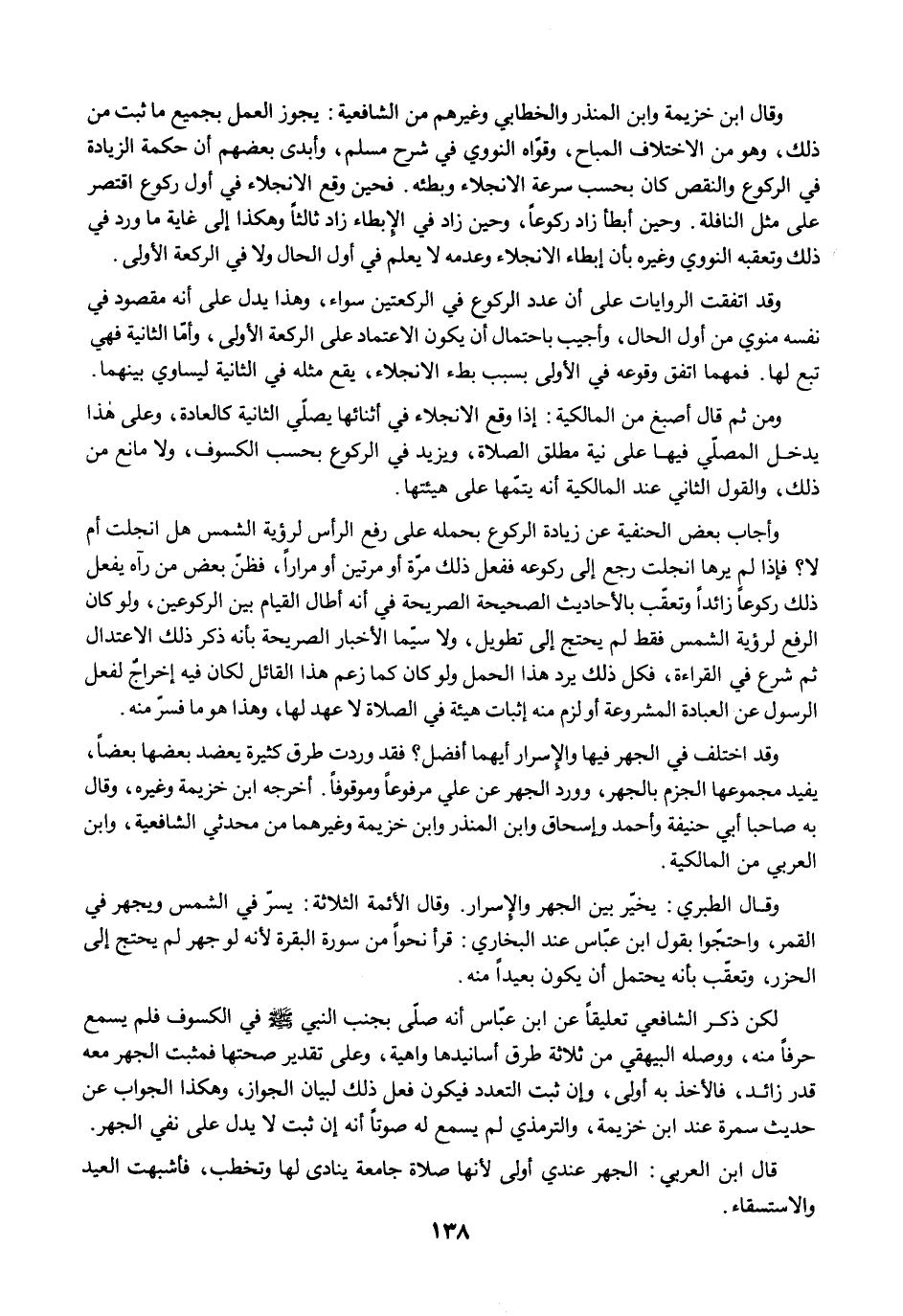 وقال الطبري: يخيّر بين الجهر والإسرار. وقال الأئمة الثلاثة: يسرّ في الشمس ويجهر في القمر، واحتجوا بقول ابن عبّاس عند البخاري: قرأ نحوًا من سورة البقرة لأنه لو جهر لم يحتج إلى الحزر، وتعقْب بأنه يحتمل أن يكون بعيدًا منه.