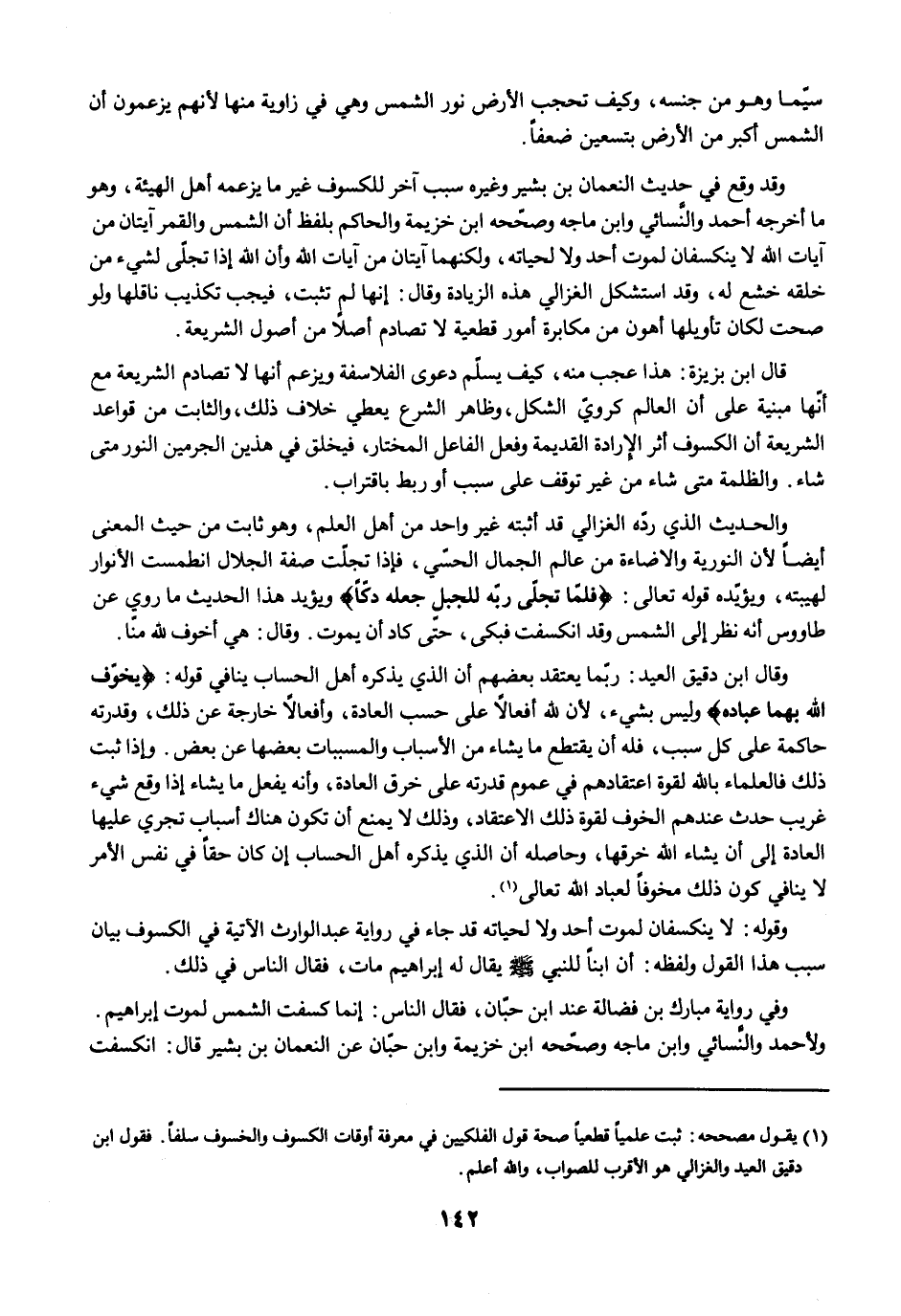 (¬1) يقول مصححه: ثبت علميًا قطعياً صحة قول الفلكيين في معرفة أوقات الكسوف والخسوف سلفًا. فقول ابن دقبق العيد والغزالى هو الأقرب للصواب، والله أعلم.