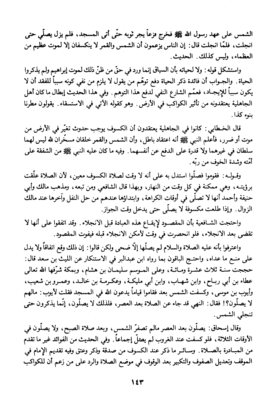 واعترفوا بأنه عليه الصلاة والسلام لم يصلّها إلاَّ ضحى ولكن قالوا: إن ذلك وقع اتفاقًا ولا يدل على منع ما عداه، واحتج الباقون بما رواه ابن عبد البر في الاستنكار عن الليث بن سعد قال: حججت سنة ثلاث عشرة ومائة، وعلى الموسم سليمان بن هشام، وبمكة شرّفها الله تعالى عطاء بن أبي رباح، وابن شهاب، وابن أبي مليكة، وعكرمة بن خالد، وعمرو بن شعيب، وأيوب بن موسى، وكسفت الشمس بعد فقاموا قيامًا يدعون الله في المسجد فقلت لأيوب: مالهم لا يصلّون؟! فقال: النهي قد جاء عن الصلاة بعد العصر، فلذلك لا يصلّون، إنّما يذكرون حتى تنجلي الشمس.
