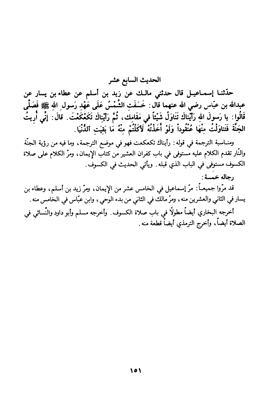 حَدَّثَنَا إِسْمَاعِيلُ قَالَ حَدَّثَنِي مَالِكٌ عَنْ زَيْدِ بْنِ أَسْلَمَ عَنْ عَطَاءِ بْنِ يَسَارٍ عَنْ عَبْدِ اللَّهِ بْنِ عَبَّاسٍ رضى الله عنهما قَالَ: خَسَفَتِ الشَّمْسُ عَلَى عَهْدِ رَسُولِ اللَّهِ -صلى الله عليه وسلم- فَصَلَّى، قَالُوا: يَا رَسُولَ اللَّهِ، رَأَيْنَاكَ تَنَاوَلُ شَيْئًا فِي مَقَامِكَ، ثُمَّ رَأَيْنَاكَ تَكَعْكَعْتَ. قَالَ: إِنِّي أُرِيتُ الْجَنَّةَ، فَتَنَاوَلْتُ مِنْهَا عُنْقُودًا، وَلَوْ أَخَذْتُهُ لأَكَلْتُمْ مِنْهُ مَا بَقِيَتِ الدُّنْيَا.
