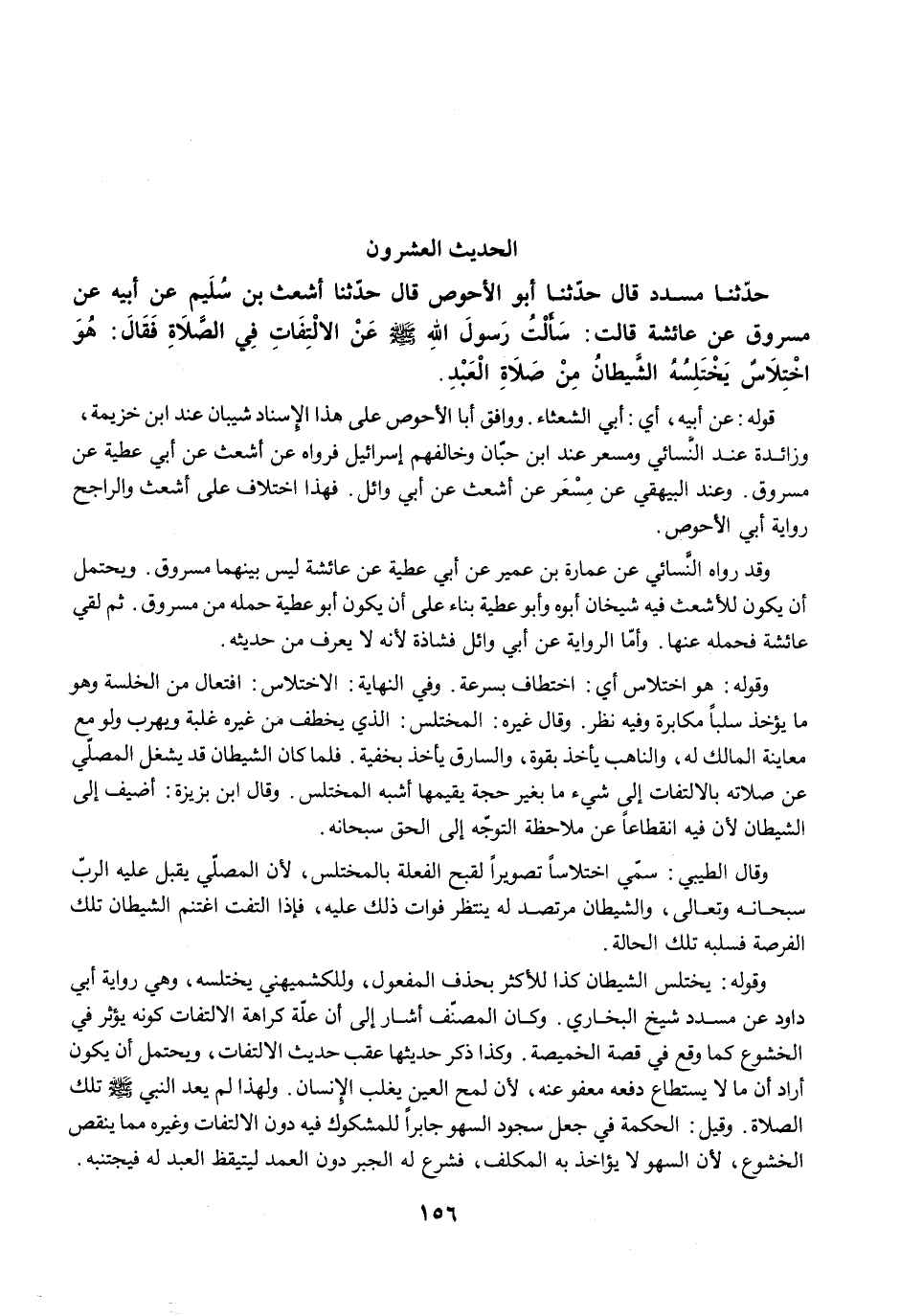 وقوله: هو اختلاس أي: اختطاف بسرعة. وفي النهاية: الاختلاس: افتعال من الخلسة وهو ما يؤخذ سلبًا مكابرة وفيه نظر. وقال غيره: المختلس: الذي يخطف من غيره غلبة ويهرب ولو مع معاينة المالك له، والناهب يأخذ بقوة، والسارق يأخذ بخفية. فلما كان الشيطان قد يشغل المصلّي عن صلاته بالالتفات إلىِ شيء ما بغير حجة يقيمها أشبه المختلس. وقال ابن بزيزة: أضيف إلى الشيطان لأن فيه انقطاعاً عن ملاحظة التوجّه إلى الحق سبحانه.