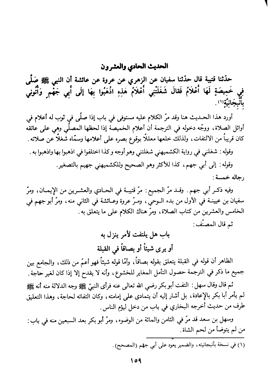 حَدَّثَنَا قُتَيْبَةُ قَالَ حَدَّثَنَا سُفْيَانُ عَنِ الزُّهْرِيِّ عَنْ عُرْوَةَ عَنْ عَائِشَةَ أَنَّ النَّبِيَّ -صلى الله عليه وسلم- صَلَّى فِي خَمِيصَةٍ لَهَا أَعْلاَمٌ فَقَالَ شَغَلَتْنِي أَعْلاَمُ هَذِهِ، اذْهَبُوا بِهَا إِلَى أَبِي جَهْمٍ وَأْتُونِي بِأَنْبِجَانِيَّةٍ (¬1).