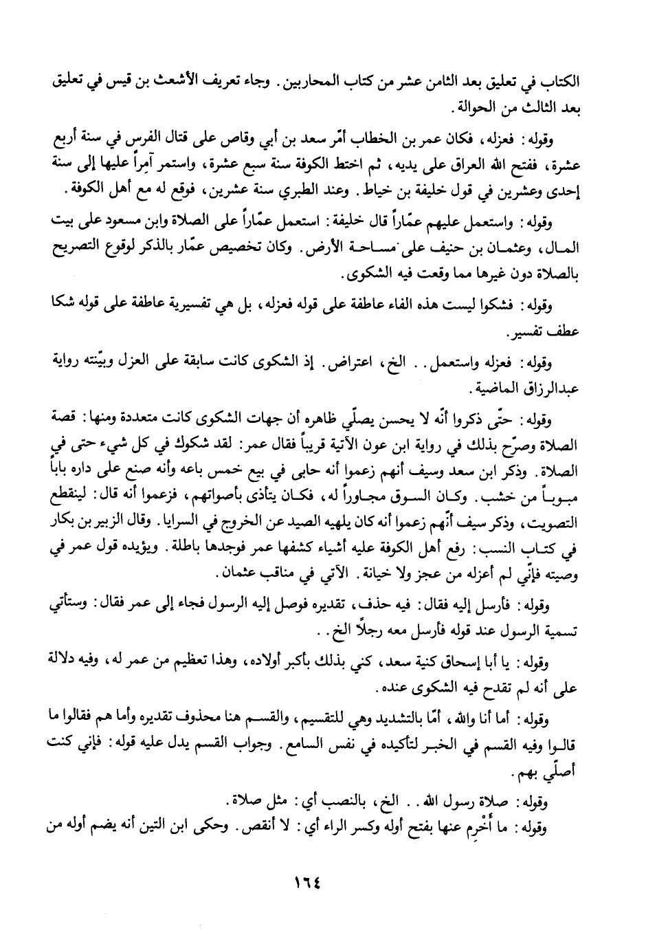 وقوله: حتّى ذكروا أنّه لا يحسن يصلّي ظاهره أن جهات الشكوى كانت متعددة ومنها: قصة الصلاة وصرّح بذلك في رواية ابن عون الآتية قريبًا فقال عمر: لقد شكوك في كل شيء حتى في الصلاة. وذكر ابن سعد وسيف أنهم زعموا أنه حابى في بيع خمس باعه وأنه صنع على داره بابًا مبوبًا من خشب. وكان السوق مجاورًا له، فكان يتأذى باصواتهم، فزعموا أنه قال: لينقطع التصويت، وذكر سيف أنّهم زعموا أنه كان يلهيه الصيد عن الخروج في السرايا. وقال الزبير بن بكار في كتاب النسب: رفع أهل الكوفة عليه أشياء كشفها عمر فوجدها باطلة. ويؤيده قول عمر في وصيته فإنيّ لم أعزله من عجز ولا خيانة. الآتي في مناقب عثمان.