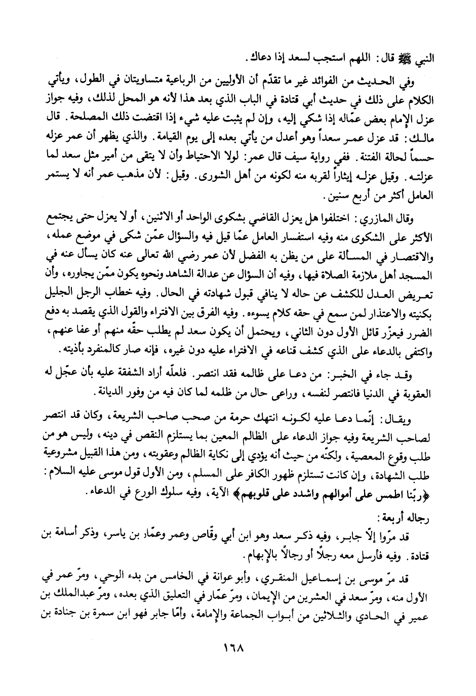 وقال المازري: اختلفوا هل يعزل القاضي بشكوى الواحد أو الاثنين، أو لا يعزل حتى يجتمع الأكثر على الشكوى منه وفيه استفسار العامل عما قيل فيه والسؤال عمّن شكى في موضع عمله، والاقتصار في المسألة على من يظن به الفضل لأن عمر رضي الله تعالى عنه كان يسأل عنه في المسجد أهل ملازمة الصلاة فيها، وفيه أن السؤال عن عدالة الشاهد ونحوه يكون ممّن يجاوره، وأن تعريض العدل للكشف عن حاله لا ينافي قبول شهادته في الحال. وفيه خطاب الرجل الجليل بكنيته والاعتذار لمن سمع في حقه كلام يسوءه. وفيه الفرق بين الافتراء والقول الذي يقصد به دفع الضرر فيعزّر قائل الأول دون الثاني، ويحتمل أن يكون سعد لم يطلب حقّه منهم أو عفا عنهم، واكتفى بالدعاء على الذي كشف قناعه في الافتراء عليه دون غيره، فإنه صار كالمنفرد بأذيته.