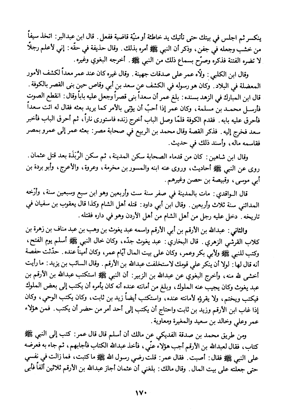 ومن طريق محمد بن صدقة الفديكي عن مالك أن أسلم قال قال عمر: كتب إلى النبي -صلى الله عليه وسلم- كتاب، فقال لعبد الله بن الأرقم أجب هؤلاء عنّي، فأخذ عبد الله الكتاب فأجابهم، ثم جاء به فعرضه على النبي -صلى الله عليه وسلم- فقال: أصبت. فقال عمر: قلت رضي رسول الله -صلى الله عليه وسلم- ما كتبت، فما زالت في نفسي حتى جعلته على بيت المال. وقال مالك: بلغني أن عثمان أجاز عبد الله بن الأرقم ثلاثين ألفًا فأبى