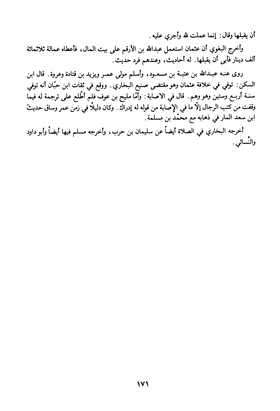 وأخرج البغوي أن عثمان استعمل عبد الله بن الأرقم على بيت المال، فأعطاه عمالة ثلاثمائة ألف دينار فأبى أن يقبلها. له أحاديث، وعندهم فرد حديث.