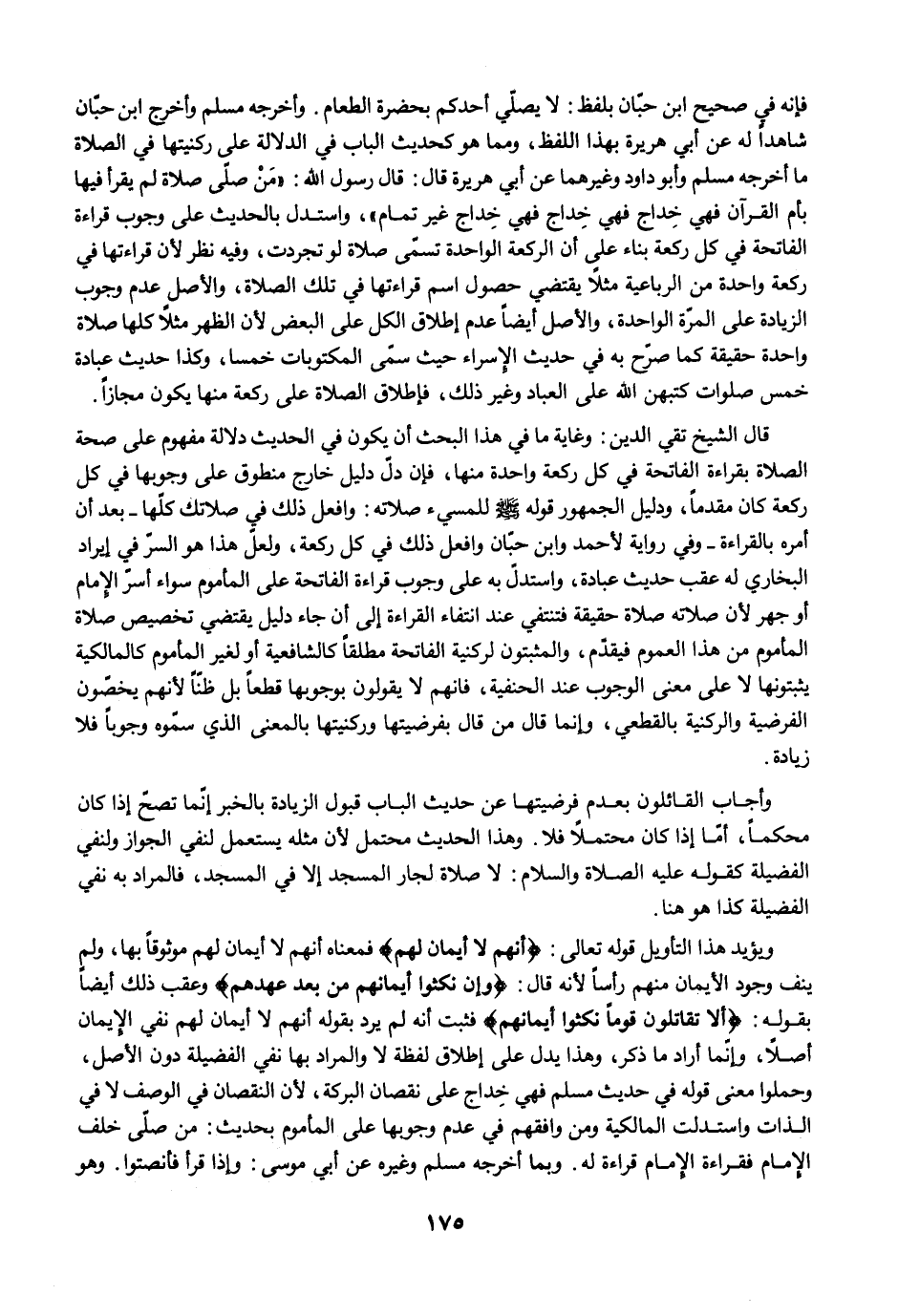 قال الشيخ تقي الدين: وغاية ما في هذا البحث أن يكون في الحديث دلالة مفهوم على صحة الصلاة بقراءة الفاتحة في كل ركعة واحدة منها، فإن دلّ دليل خارج منطوق على وجوبها في كل ركعة كان مقدمًا، ودليل الجمهور قوله -صلى الله عليه وسلم- للمسيء صلاته: وافعل ذلك في صلاتك كلّها -بعد أن أمره بالقراءة- وفي رواية لأحمد وابن حبّان وافعل ذلك في كل ركعة، ولعلّ هذا هو السرّ في إيراد البخاري له عقب حديث عبادة، واستدلّ به على وجوب قراءة الفاتحة على المأموم سواء أسرّ الإِمام أو جهر لأن صلاته صلاة حقيقة فتنتفي عند انتفاء القراءة إلى أن جاء دليل يقتضي تخصيص صلاة المأموم من هذا العموم فيقدّم، والمثبتون لركنية الفاتحة مطلقًا كالشافعية أو لغير المأموم كالمالكية يثبتونها لا على معنى الوجوب عند الحنفية، فانهم لا يقولون بوجولها قطعًا بل ظناً لأنهم يخصّون الفرضية والركنية بالقطعي، وإنما قال من قال بفرضيتها وركنيتها بالمعنى الذي سمّوه وجوبًا فلا زيادة.