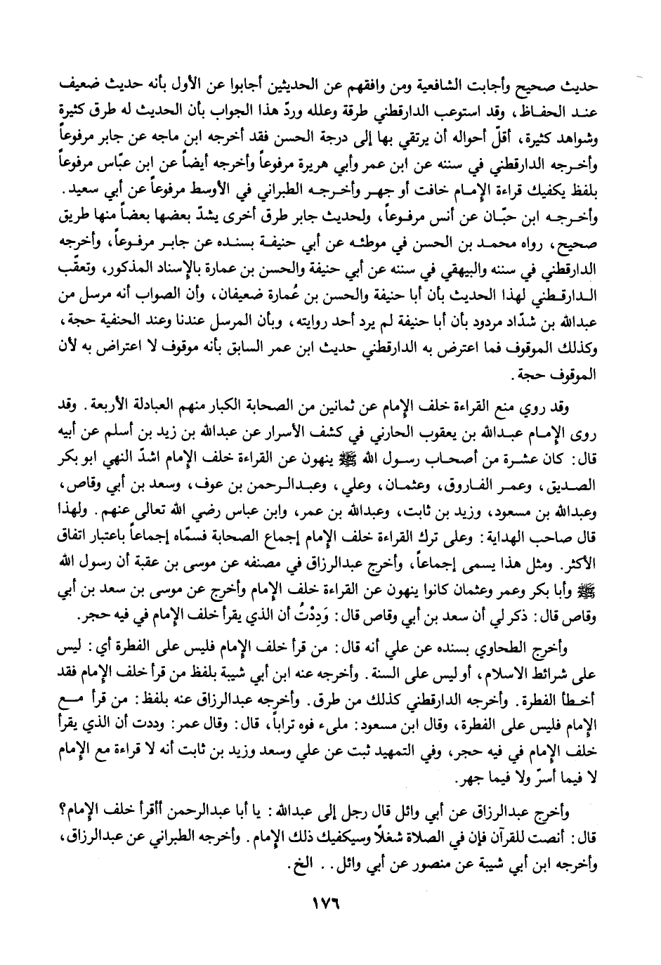 حديث صحيح وأجابت الشافعية ومن وافقهم عن الحديثين أجابوا عن الأول بأنه حديث ضعيف عند الحفاظ، وقد استوعب الدارقطني طرقة وعلله وردّ هذا الجواب بأن الحديث له طرق كثيرة وشواهد كثيرة، أقلّ أحواله أن يرتقي بها إلى درجة الحسن فقد أخرجه ابن ماجه عن جابر مرفوعًا وأخرجه الدارقطني في سننه عن ابن عمر وأبي هريرة مرفوعًا وأخرجه أيضًا عن ابن عبّاس مرفوعًا بلفظ يكفيك قراءة الإِمام خافت أو جهر وأخرجه الطبراني في الأوسط مرفوعًا عن أبي سعيد. وأخرجه ابن حبّان عن أنس مرفوعًا، ولحديث جابر طرق أخرى يشدّ بعضها بعضًا منها طريق صحيح، رواه محمد بن الحسن في موطئه عن أبي حنيفة بسنده عن جابر مرفوعًا، وأخرجه الدارقطني في سننه والبيهقي في سننه عن أبي حنيفة والحسن بن عمارة بالإسناد المذكور، وتعقّب الدارقطني لهذا الحديث بأن أبا حنيفة والحسن بن عُمارة ضعيفان، وأن الصواب أنه مرسل من عبد الله بن شدّاد مردود بان أبا حنيفة لم يرد أحد روايته، وبأن المرسل عندنا وعند الحنفية حجة، وكذلك الموقوف فما اعترض به الدارقطني حديث ابن عمر السابق بأنه موقوف لا اعتراض به لأن الموقوف حجة.