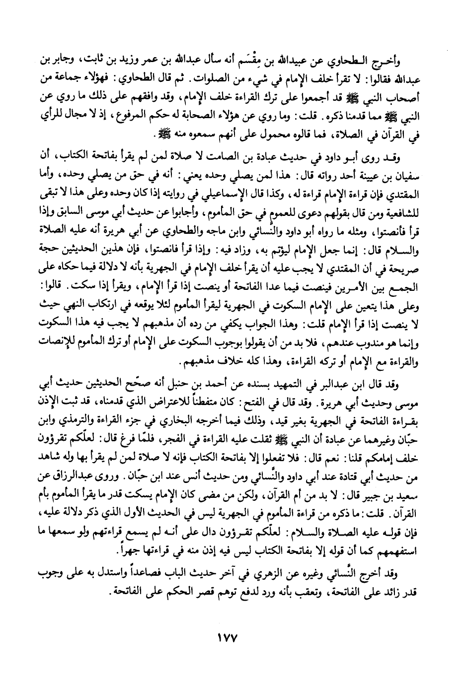 وقد قال ابن عبد البر في التمهيد بسنده عن أحمد بن حنبل أنه صحّح الحديثين حديث أبي موسى وحديث أبي هريرة. وقد قال في الفتح: كان متفطنًا للاعتراض الذي قدمناه، قد ثبت الإذن بقراءة الفاتحة في الجهرية بغير قيد، وذلك فيما أخرجه البخاري في جزء القراءة والترمذي وابن حبّان وغيرهما عن عبادة أن النبي -صلى الله عليه وسلم- ثقلت عليه القراءة في الفجر، فلمّا فرغ قال: لعلّكم تقرؤون خلف إمامكم قلنا: نعم قال: فلا تفعلوا إلا بفاتحة الكتاب فإنه لا صلاة لمن لم يقرأ بها وله شاهد من حديث أبي قتادة عند أبي داود والنَّسائي ومن حديث أنس عند ابن حبّان. وروى عبد الرزاق عن سعيد بن جبير قال: لابد من أم القرآن، ولكن من مضى كان الإِمام يسكت قدر ما يقرأ المأموم بأم القرآن. قلت: ما ذكره من قراءة المأموم في الجهرية ليس في الحديث الأول الذي ذكر دلالة عليه، فإن قوله عليه الصلاة والسلام: لعلّكم تقرؤون قال على أنه لم يسمع قراءتهم ولو سمعها ما استفهمهم كما أن قوله إلا بفاتحة الكتاب ليس فيه إذن منه في قراءتها جهرًا.