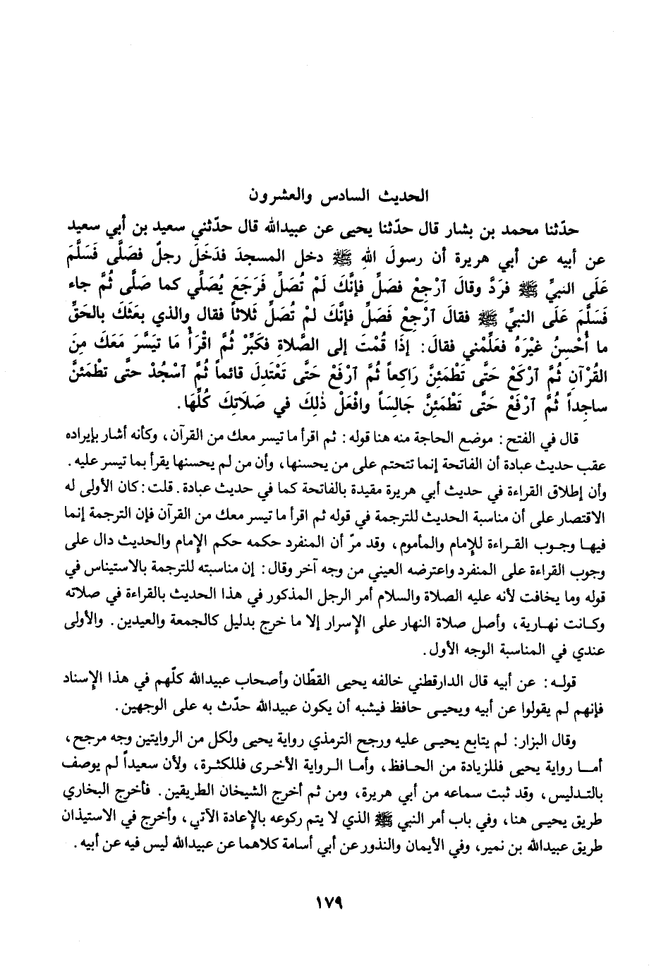 وقال البزار: لم يتابع يحيى عليه ورجح الترمذي رواية يحيى ولكل من الروايتين وجه مرجح، أما رواية يحيى فللزيادة من الحافظ، وأما الرواية الأخرى فللكثرة، ولأن سعيدًا لم يوصف بالتدليس، وقد ثبت سماعه من أبي هريرة، ومن ثم أخرج الشيخان الطريقين. فأخرج البخاري طريق يحيى هنا، وفي باب أمر النبي -صلى الله عليه وسلم- الذي لا يتم ركوعه بالإعادة الآتي، وأخرج في الاستيذان طريق عبيد الله بن نمير، وفي الأيمان والنذور عن أبي أسامة كلاهما عن عبيد الله ليس فيه عن أبيه.
