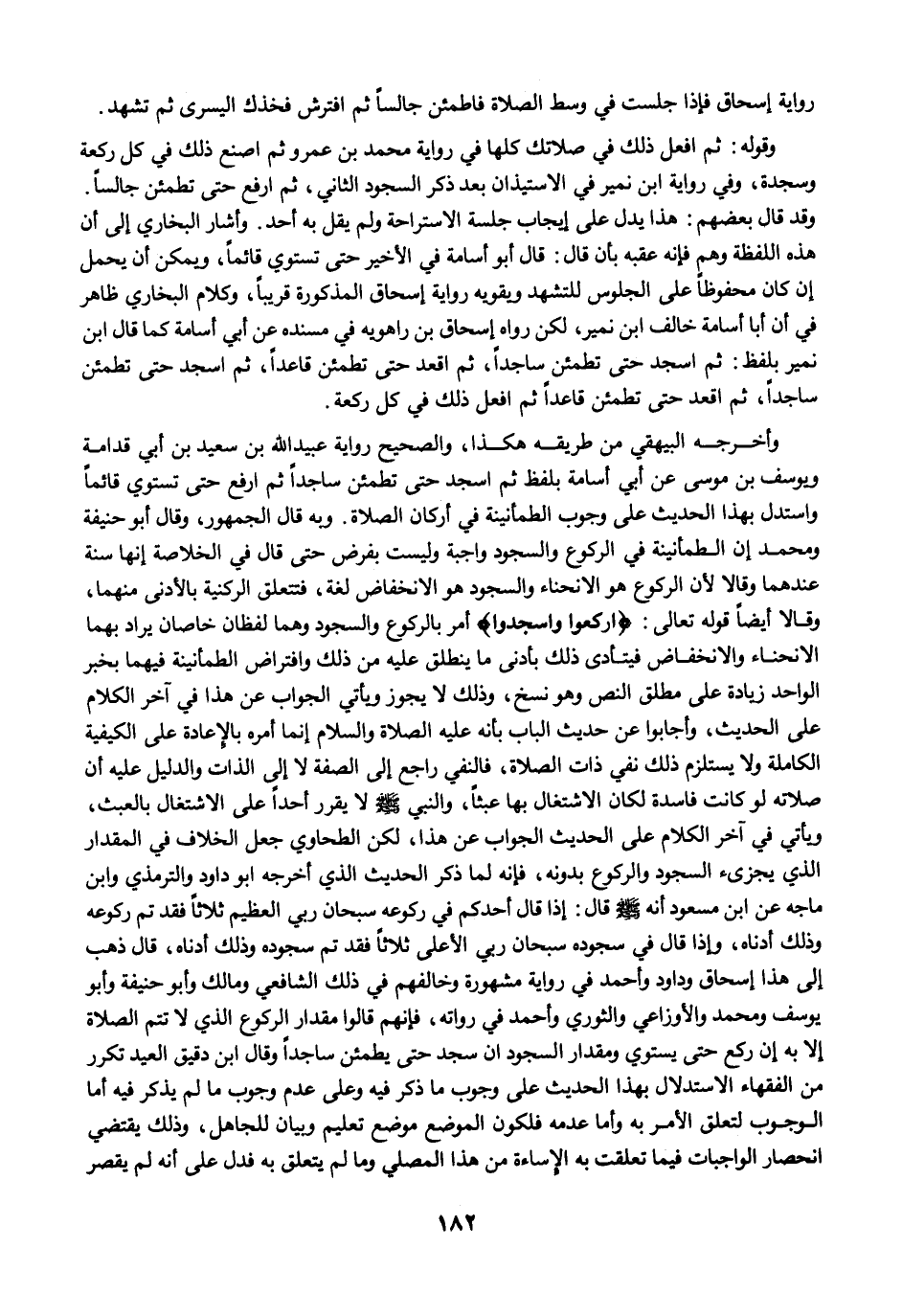 وأخرجه البيهقي من طريقه هكذا، والصحيح رواية عبيد الله بن سعيد بن أبي قدامة ويوسف بن موسى عن أبي أسامة بلفظ ثم اسجد حتى تطمئن ساجدًا ثم ارفع حتى تستوي قائمًا واستدل بهذا الحديث على وجوب الطمأنينة في أركان الصلاة. وبه قال الجمهور، وقال أبو حنيفة ومحمد إن الطمأنينة في الركوع والسجود واجبة وليست بفرض حتى قال في الخلاصة إنها سنة عندهما وقالا لأن الركوع هو الانحناء والسجود هو الانخفاض لغة، فتتعلق الركنية بالأدنى منهما، وقالا أيضًا قوله تعالى: {ارْكَعُوا وَاسْجُدُوا} أمر بالركوع والسجود وهما لفظان خاصان يراد بهما الانحناء والانخفاض فيتأدى ذلك بأدنى ما ينطلق عليه من ذلك وافتراض الطمأنينة فيهما بخبر الواحد زيادة على مطلق النص وهو نسخ، وذلك لا يجوز ويأتي الجواب عن هذا في آخر الكلام على الحديث، وأجابوا عن حديث الباب بأنه عليه الصلاة والسلام انما أمره بالإعادة على الكيفية الكاملة ولا يستلزم ذلك نفي ذات الصلاة، فالنفي راجع إلى الصفة لا إلى الذات والدليل عليه أن صلاته لو كانت فاسدة لكان الاشتغال بها عبثًا، والنبي -صلى الله عليه وسلم- لا يقرر أحدًا على الاشتغال بالعبث، ويأتي في آخر الكلام على الحديث الجواب عن هذا، لكن الطحاوي جعل الخلاف في المقدار الذي يجزىء السجو والركوع بدونه، فإنه لما ذكر الحديث الذي أخرجه أبو داود والترمذي وابن ماجه عن ابن مسعود أنه -صلى الله عليه وسلم- قال: إذا قال أحدكم ني ركوعه سبحان ربي العظيم ثلالًا فقد تم ركوعه وذلك أدناه، وإذا قال في سجودة سبحان ري الأعلى ثلاثًا فقد تم سجوده وذلك أدناه، قال ذهب إلى هذا إسحاق وداود وأحمد في رواية مشهورة وخالفهم في ذلك الشافعي ومالك وأبو حنيفة وأبو يوسف ومحمد والأوزاعي والثوري وأحمد في رواته، فإنهم قالوا مقدار الركوع الذي لا تتم الصلاة إلا به إن ركع حتى يستوي ومقدار السجود إن سجد حتى يطمئن ساجداً وقال ابن دقيق العيد تكرر من الفقهاء الاستدلال بهذا الحديث على وجوب ما ذكر فيه وعلى عدم وجوب ما لم يذكر فيه أما الوجوب لتعلق الأمر به وأما عدمه فلكون الموضع موضع تعليم وييان للجاهل، وذلك يقتضي انحصار الواجبات فيما تعلقت به الإساءة من هذا المصلي وعا لم يتعلق به فدل على أنه لم يقصر