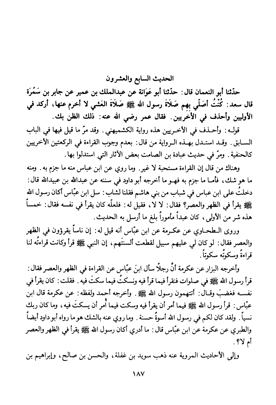 وأخرجه البزار عن عكرمة أنَّ رجلًا سأل ابنَ عبّاس عن القراءة في الظهر والعصر فقال: قرأ رسول الله -صلى الله عليه وسلم- في صلوات فنقرأ فيما قرأ فيه ونسكتُ فيما سكتَ فيه. فقلت: كان يقرأ في نفسه فغضبَ وقال: أتتهمون رسول الله -صلى الله عليه وسلم-. وأخرجه أحمد ولفظه: عن عكرمة قال ابن عبّاس: قرأ رسول الله -صلى الله عليه وسلم- فيما أمر أن يقرأ فيه وسكت فيما أُمر أن يسكتَ فيه، وما كان ربك نسيًا. ولقد كان لكم في رسول الله أسوةٌ حسنة. وما روي عنه بالشك هو ما رواه أبو داود أيضًا والطبري عن عكرمة عن ابن عبّاس قال: ما أدري أكان رسول الله -صلى الله عليه وسلم- يقرأ في الظهر والعصر أم لا؟.