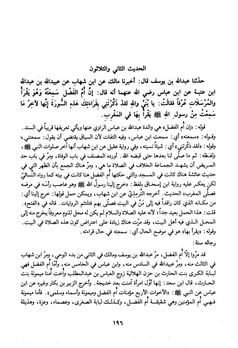 قد مرّوا إلاَّ أم الفضل، مرَّ عبد الله بن يوسف ومالك في الثاني من بدء الوحي، ومرّ ابن شهاب في الثالث منه، ومرَّ عبيد الله في السادس منه، وابن عباس في الخامس منه، وأمّا أُم الفضل فهي لبابة الكبرى بنت الحارث بن حزن الهلالية زوج العباس بن عبد المطلب وأُخت أُمنا ميمونة بنت الحارث، قال ابن سعد: إنها أوّل امرأة آمنت بعد خديجة. وأخرج الزبير بن بكار وغيره عن ابن عباس عن النبي -صلى الله عليه وسلم-: "الأخوات الأربع مؤمنات أُم الفضل وميمونة وأسماء وسلمى". فأما ميمونة فهي أُم المؤمنين وهي شقيقة أُم الفضل، وكذلك لبابة الصغرى، وعصماء، وعزة، وهذيلة
