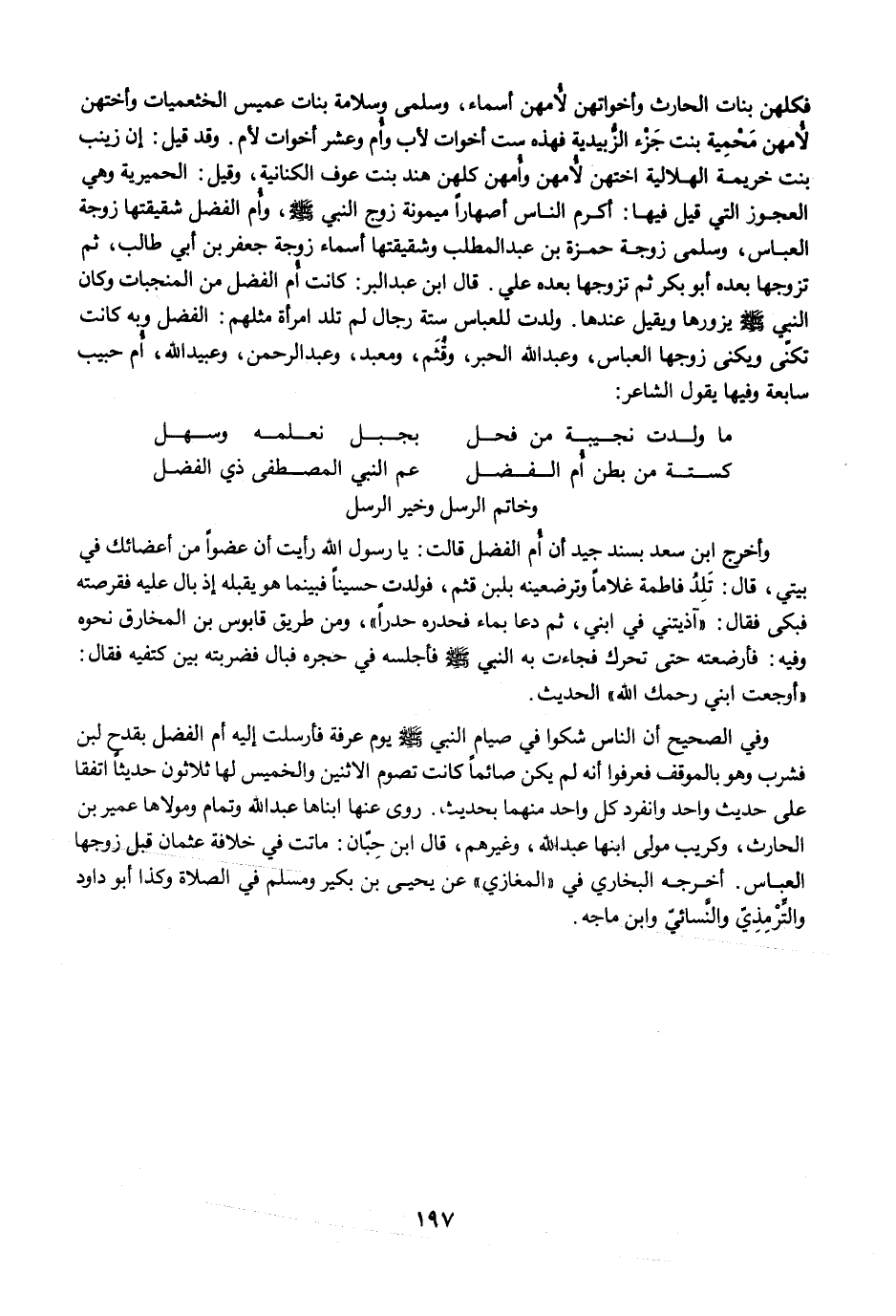 وفي الصحيح أن الناس شكوا في صيام النبي -صلى الله عليه وسلم- يوم عرفة فأرسلت إليه أم الفضل بقدح لبن فشرب وهو بالموقف فعرفوا أنه لم يكن صائمًا كانت تصوم الاثنين والخميس لها ثلاثون حديثاً اتفقا على حديث واحد وانفرد كل واحد منهما بحديث. روى عنها ابناها عبد الله وتمام ومولاها عمير بن الحارث، وكريب مولى ابنها عبد الله، وغيرهم، قال ابن حِبّان: ماتت في خلافة عثمان قبل زوجها العباس. أخرجه البخاري في "المغازي" عن يحيى بن بكير ومسلم في الصلاة وكذا أبو داود والتِّرْمذِيّ والنَّسائيّ وابن ماجه.
