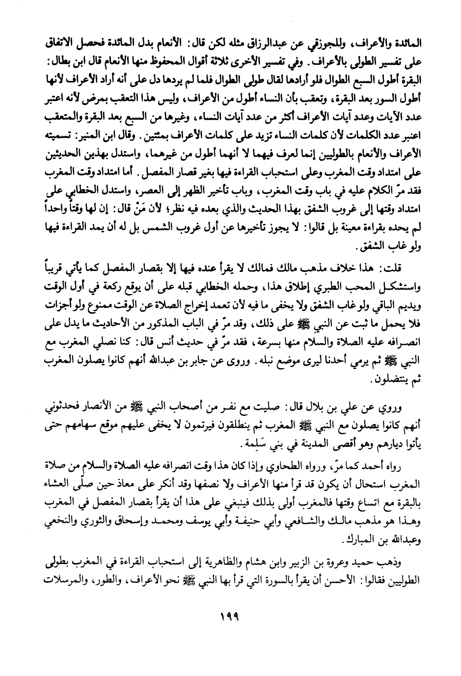 رواه أحمد كما مرّ، ورواه الطحاوي وإذا كان هذا وقت انصرافه عليه الصلاة والسلام من صلاة المغرب استحال أن يكون قد قرأ منها الأعراف ولا نصفها وقد أنكر على معاذ حين صلّى العشاء بالبقرة مع إتساع وقتها فالمغرب أولى بذلك فينبغي على هذا أن يقرأ بقصار المفصل في المغرب وهذا هو مذهب مالك والشافعي وأبي حنيفة وأبي يوسف ومحمد وإسحاق والثوري والنخعي وعبد الله بن المبارك.