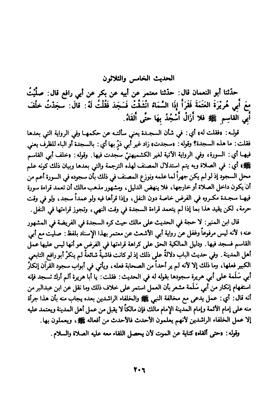 قال ابن المنير: لا حجة في الحديث على مالك حيث كره السجدة في الفريضة في المشهور عنه؛ لأنه ليس مرفوعًا وغفل عن رواية أبي الأشعث عن معتمر بهذا الإسناد بلفظ: صليت مع أبي القاسم فسجد فيها. ودليل المالكية الحق على كراهة قراءتها في الفرض هو أنها ليس عليها عمل أهل المدينة. وفي حديث الباب دلالةٌ على ذلك إذ لو كانت فاشيةً شائعةً لم ينكرْ أبو رافع التابعي الكبير فعلها، وما ذلك إلا لأنه لم ير أحدًا من الصحابة فعله، ويأتي في أبواب سجود القرآن إنكارُ أبي سَلَمة على أبي هريرة سجودها بقوله له في الحديث: فقلت: يا أبا هريرة ألم أرك تسجد فإنه استفهام إنكار من أبي سَلَمة مشعر بأن العمل استمر على خلاف ذلك وما نقل عن ابن عبد البر من أنه قال: أي: عمل يدعى مع مخالفة النبي -صلى الله عليه وسلم- والخلفاء الراشدين بعده يجاب منه بأن هذا جرأة منه على إمام الأئمة وإمام المدينة الإِمام مالك فإن مالكًا لا يقبل من عمل أهل المدينة ويعتمد عليه إلا عمل الخلفاء الراشدين لأنهم يعلمون الأحدث فالأحدث من أفعاله -صلى الله عليه وسلم-، ويعملون بها.