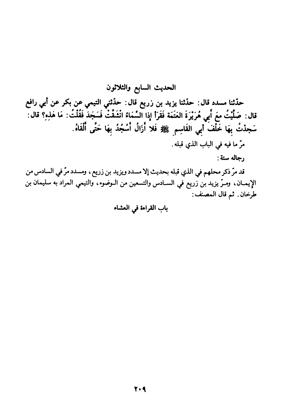 حَدَّثَنَا مُسَدَّدٌ قَالَ: حَدَّثَنَا يَزِيدُ بْنُ زُرَيْعٍ قَالَ: حَدَّثَنِي التَّيْمِىُّ عَنْ بَكْرٍ عَنْ أَبِي رَافِعٍ قَالَ: صَلَّيْتُ مَعَ أَبِي هُرَيْرَةَ الْعَتَمَةَ فَقَرَأَ إِذَا السَّمَاءُ انْشَقَّتْ فَسَجَدَ فَقُلْتُ: مَا هَذِهِ؟ قَالَ: سَجَدْتُ بِهَا خَلْفَ أَبِي الْقَاسِمِ -صلى الله عليه وسلم- فَلاَ أَزَالُ أَسْجُدُ بِهَا حَتَّى أَلْقَاهُ.